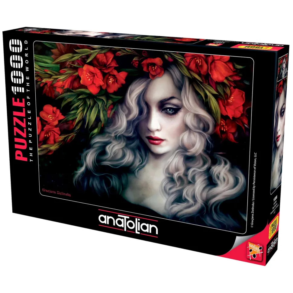 Assemblez patiemment les pièces de ce puzzle et découvrez une superbe oeuvre de l’illustratrice Gracjana Zielinska. Elle y représente une jeune femme aux cheveux blonds platine, aux grands yeux bleus maquillés de noir et la bouche rouge. Pensive et énigmatique elle porte sur la tête un large bouquet de fleurs rouges.