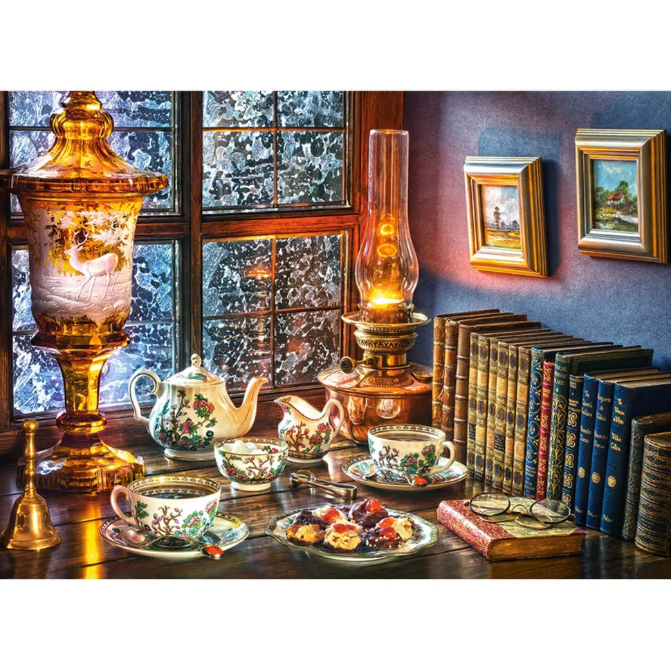 Appréciez ce thé de l’après-midi, celui que l’on prend l’hiver lorsqu’il fait bien froid dehors et qui nous réchauffe dans un moment de détente des plus agréable à la lumière d’une chandelle. Dans cette illustration, le thé est déjà servi dans deux tasses accompagné de gourmandises et n’attend plus que les propriétaires pour le déguster.Ce puzzle de marque Castorland fabriqué en Pologne est un puzzle composé de 1000 pièces conçues en carton. De difficulté moyenne, il est adapté aux « puzzleurs » de plus de 12 ans. De format paysage, il mesure une fois assemblé 68 cm de longueur et 47 cm de largeur.