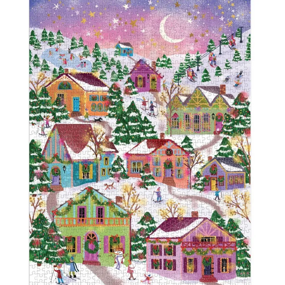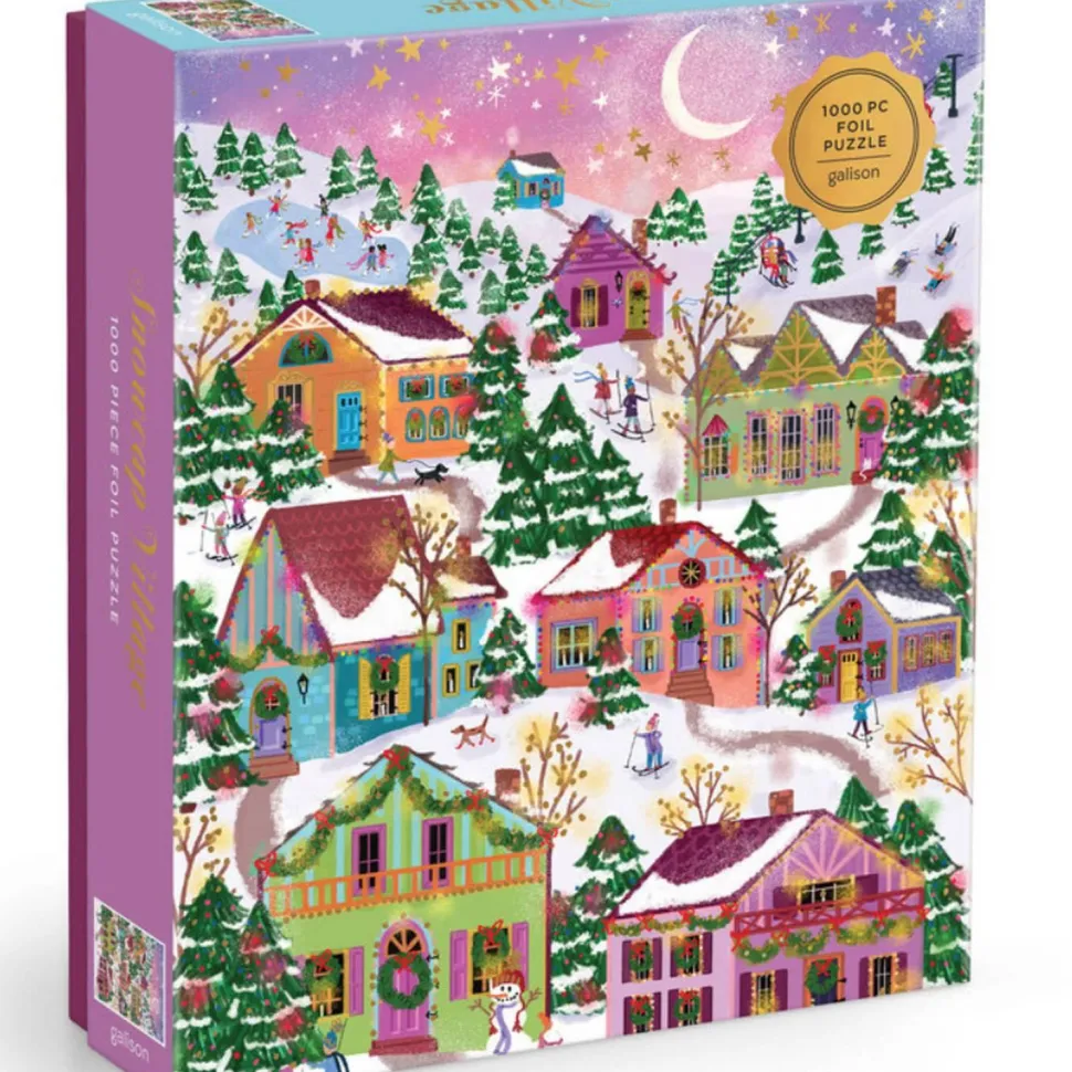 Le puzzle en aluminium 1000 pièces Snowcap Village de Galison présente un village enneigé rempli de chalets se préparant pour la saison des fêtes.