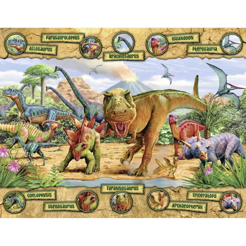 Votre enfant se passionne pour les dinosaures et s’il sait déjà reconnaître les espèces les plus connues, ce puzzle lui permettra d’en apprendre aussi de nouvelles. Ce puzzle se présente comme une illustration représentant des dinosaures accompagnée d’une frise en haut et en bas avec le nom des espèces.