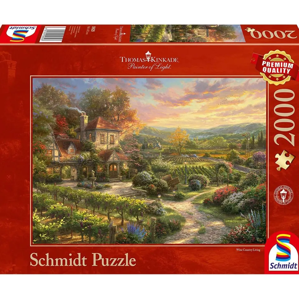 Thomas Kinkade, le peintre de la lumière, met en valeur des plaisirs simples. Un lieu magique… Cette demeure perdue dans la nature donne l’envie de s’y poser. Les arbres, les montagnes, les vignes et leurs grappes de raisins décorent à merveille ce paysage.Ce puzzle en carton de la marque Schmidt a pour thème Dans les vignes. Composé de 2000 pièces, il est de difficile à réaliser et sera donc adapté aux plus de 15 ans. De format paysage, il mesure une fois assemblé 96.8 cm de longueur et 69.2 cm de largeur.