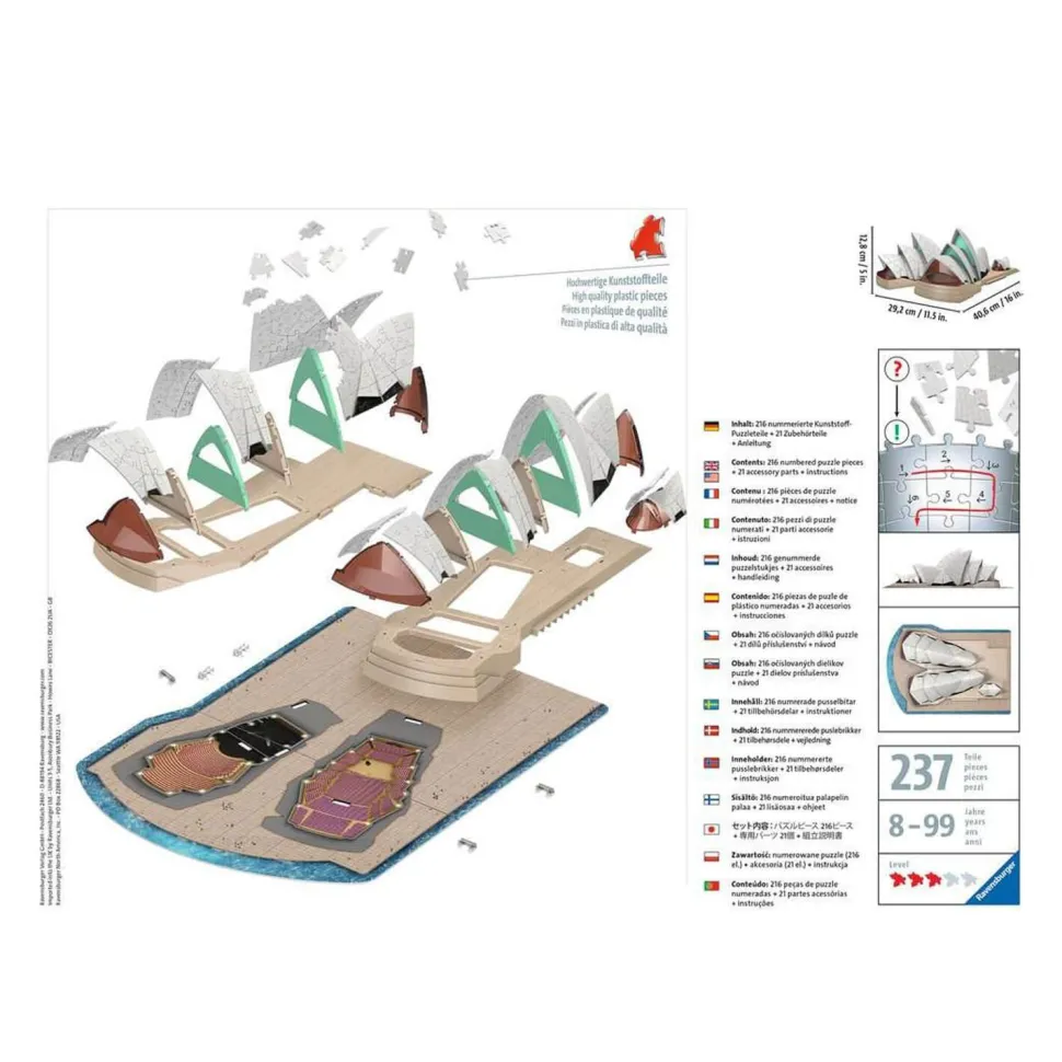 Cette superbe reproduction en 3D de l’Opéra de Sydney est constituée de 216 pièces de puzzles en plastique numérotées, ainsi que d’accessoires uniques pour finaliser l’édifice.