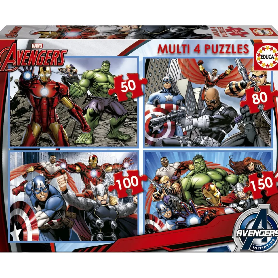 Retrouvez vos super-héros préférés du comics Avengers sous forme de multi puzzle. Assemblez les différentes pièces, et au fur et à mesure vous découvrirez Hulk, Iron Man, Thor, Captain America et les autres personnages de la bande dessinée.La boite contient 4 puzzles de format paysage correspondant à des niveaux différents : 50 pièces, 80 pièces, 100 pièces et 150 pièces.Ces 4 puzzles Educa sur le thème des Avengers sont destinés aux enfants de plus de 5 ans. Ces puzzles en carton sont fabriqués en Espagne.