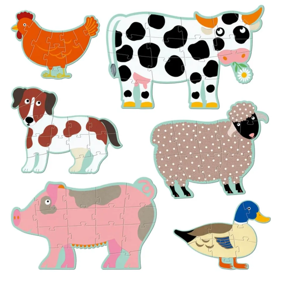 Ce coffret comprend 6 puzzles géants, pour assembler 6 animaux de la ferme : un mouton, une poule, un chien, un canard, une vache et un cochon. Ces puzzles évolutifs possèdent des nombres de pièces différentes : 9, 12 ou 15 pièces.