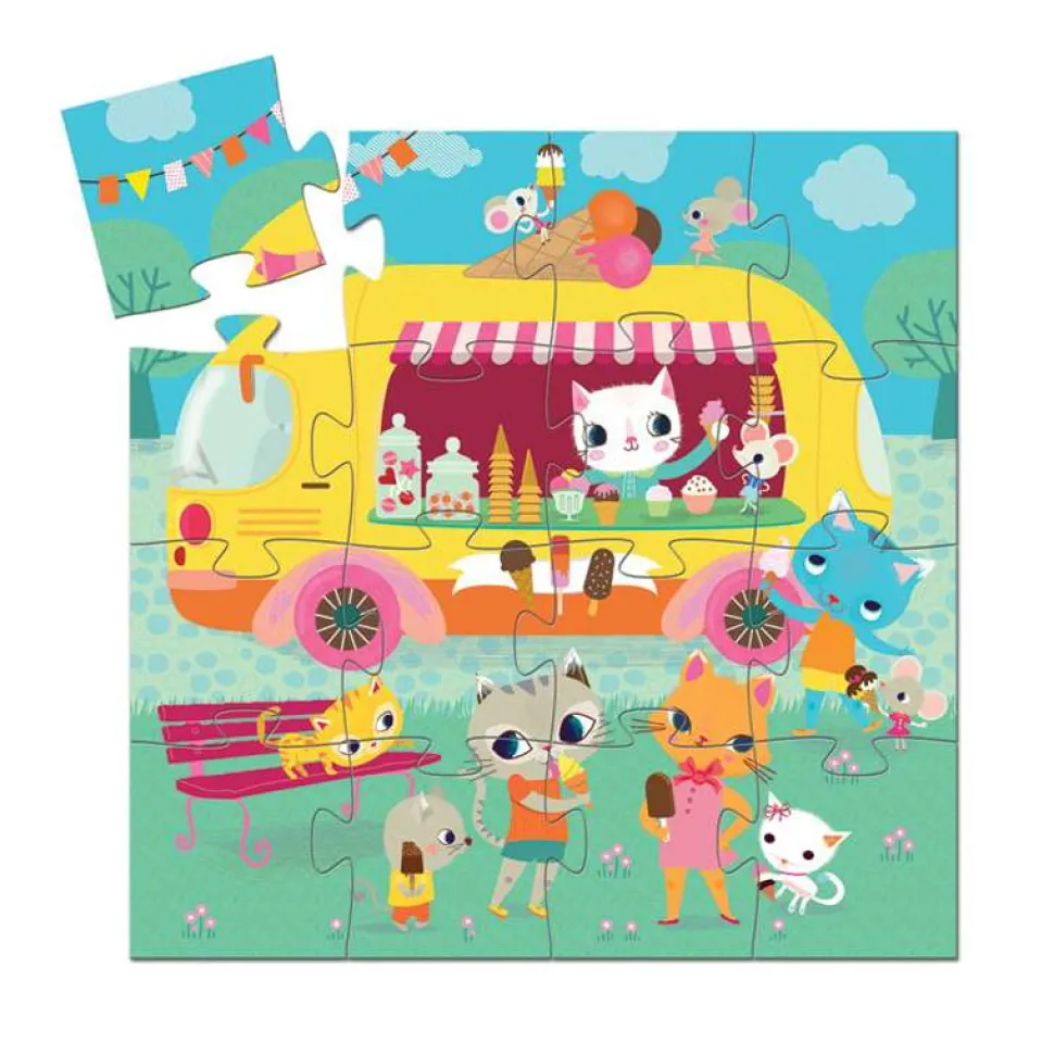 Par un temps magnifique et estival, il est toujours agréable de se rafraichir avec une glace. Pour cela, un chat a emmené son camion au parc puis vend des glaces aux chats et souris se baladant.Ce puzzle Djeco a pour thème les chats et les vacances. Il est composé de 16 pièces en carton. C’est un puzzle facile à réaliser, adapté aux enfants de 3 à 5 ans. De format carré, il mesure une fois assemblé 25 cm de longueur pour 25 cm de largeur.La jolie boîte de rangement du puzzle est colorée et prend la forme du glacier.Dimensions de la boîte : 21.8 x 11.3 x 5 cm.