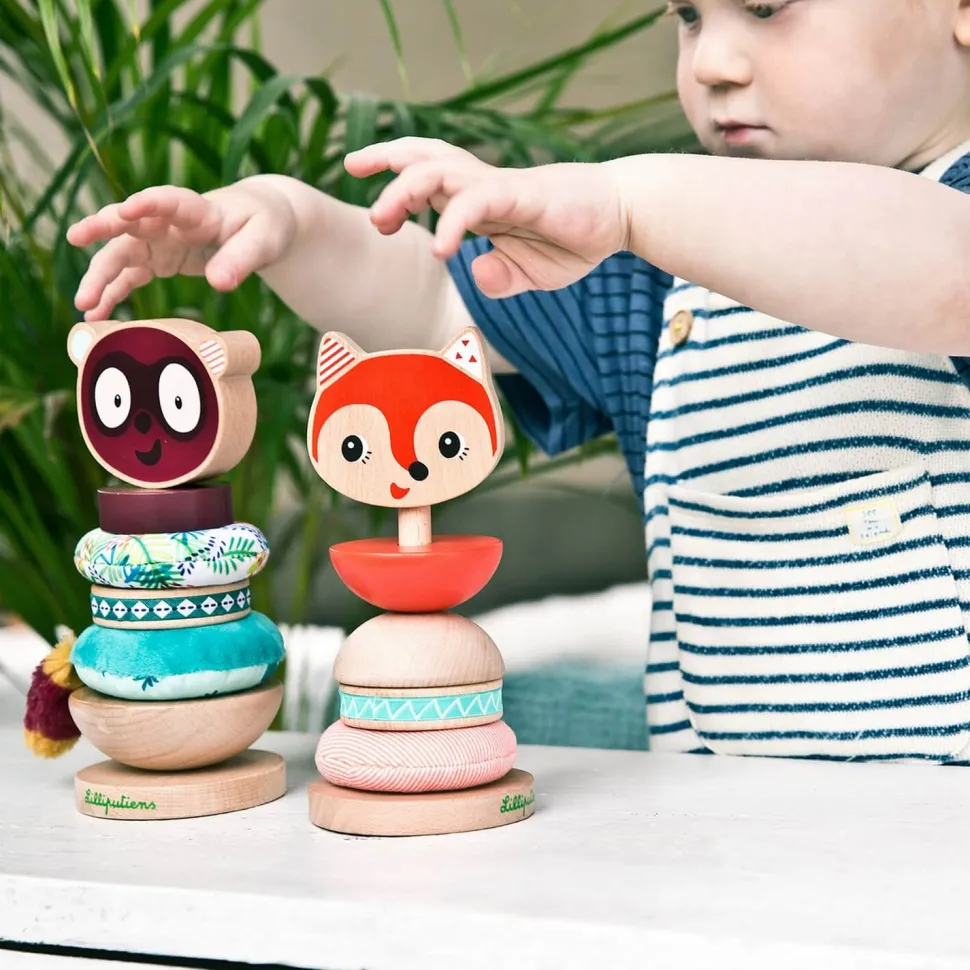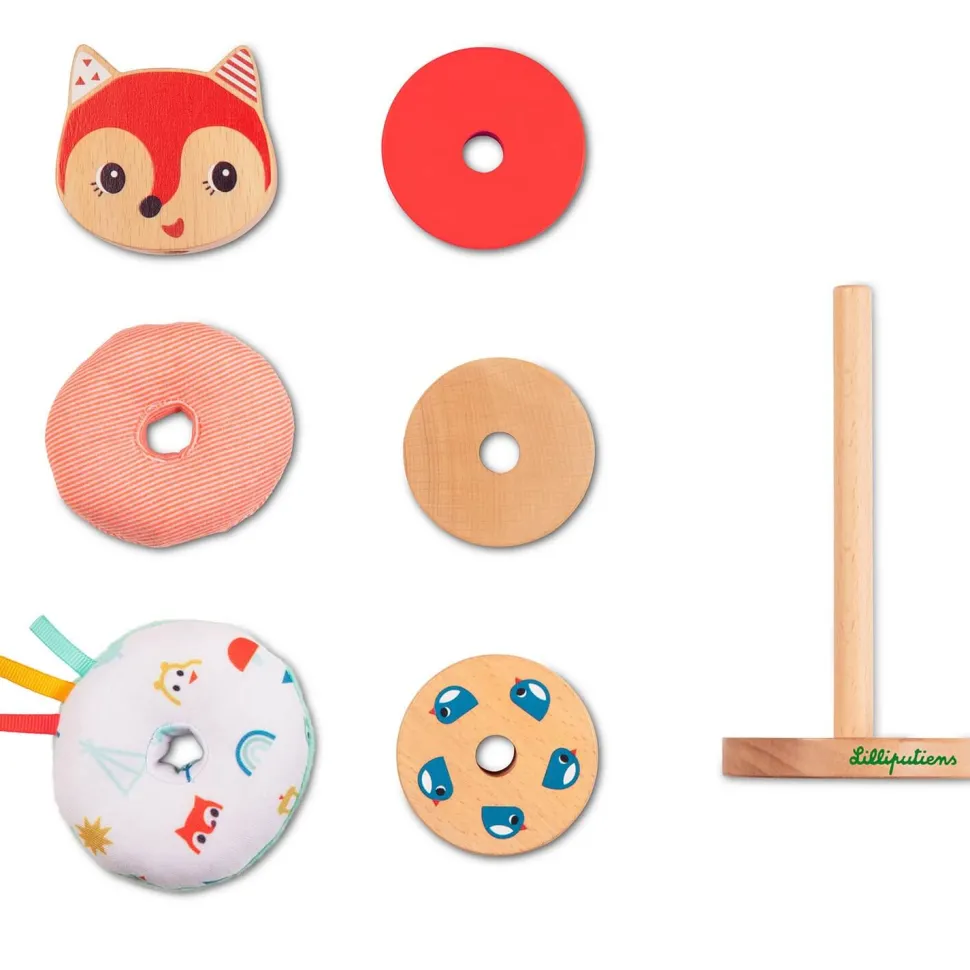 Nous retrouvons Alice la petite renarde de chez Lilliputiens pour cette pyramide à empiler. Il va falloir aider Alice à grimper au sommet de la pyramide.Ce superbe jeu fait de bois et de tissu va développer la motricité de votre enfant. Il devra empiler les uns sur les autres les éléments de la pyramide sur la tige en bois, et sans oublier la tête de Alice la renarde pour la terminer.L’enfant pourra choisir l’ordre qu’il souhaite pour former sa pyramide. Les différentes formes et matières développeront son sens du toucher.Dimensions : 18 x 8 cmMatière : Polyester et boisLavage en machine à 30°C sans les parties en bois.