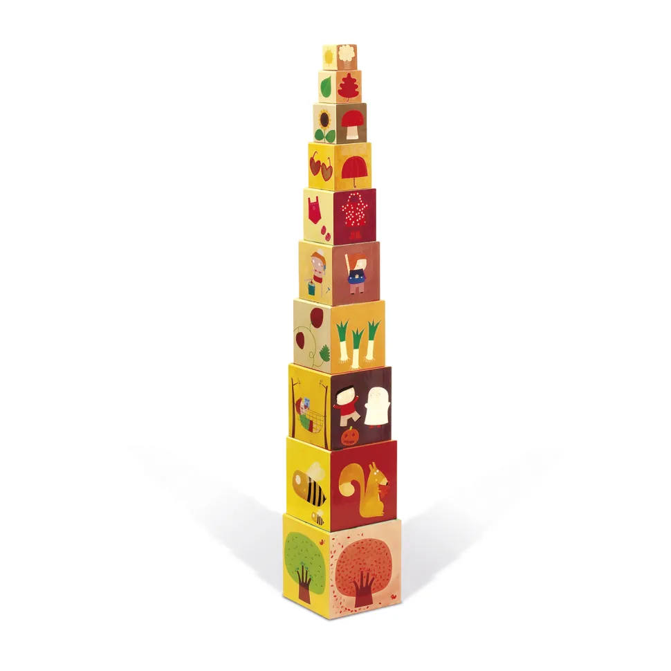 Jolie pyramide de cubes carrés en carton sur le thème des « 4 saisons », pour développer sa motricité et son imagination tout en s’amusant ! 10 cubes à empiler pour découvrir le printemps, l’été, l’automne et l’hiver. Chaque pièce est très joliment illustrée avec les animaux, les plantes et les caractéristiques de chaque saison. Les cubes posés les uns à côté des autres représentent une jolie fresque. Contient : 10 pièces à empiler. Type de boîte : valisette carrée facile à transporter grâce à sa poignée en tissu. Design réalisé en France.Dimensions : 13.5 x 13.5 x 87 cm.