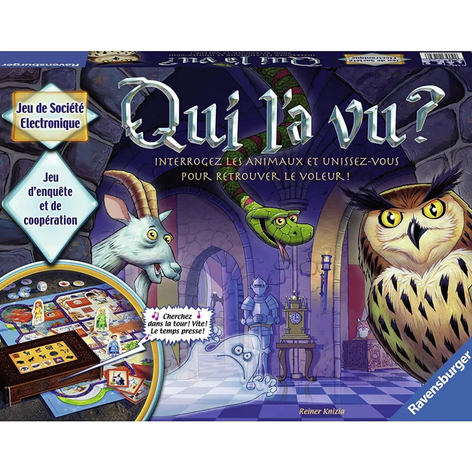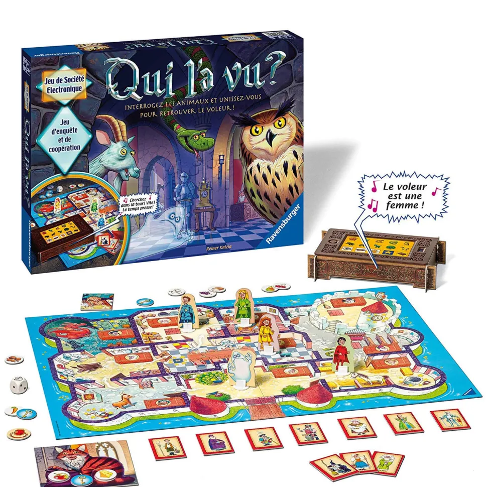 Qui l’a vu ? un jeu d’enquête et de coopération électronique pour les enfants à partir de 6 ans !Interrogez les animaux et unissez-vous pour retrouver le voleur !Une grande agitation règne au château: la bague magique du roi a été volée! Cette bague est la seule à protéger le royaume du méchant sorcier ! Les animaux du château ont vu le voleur, mais seuls les enfants comprennent la langue des animaux. Hey, les enfants c’est à vous de jouer ! Unissez-vous et avancez ensemble, car c’est le seul moyen de retrouver le voleur! Parcourez les pièces, parlez avec les animaux et récoltez un maximum d’indices pour retrouver la bague magique avant l’arrivée du méchant sorcier ! Ce Jeu de coopération propose des parties toujours différentes grâce au coffre magique interactif.Contenu de la boîte : – 1 coffre électronique,- 1 habillage de coffre en carton (en 4 parties), – 1 dé,- 1 plateau de jeu, – 1 plateau chat,- 5 figurines en carton,- 5 socles,- 14 jetons Nourriture Clés et Bague,- 4 tuiles portes, – 10 portraits de suspects,- 1 règle de jeu. Fonctionne avec 3 plies LR06 (non fournies).