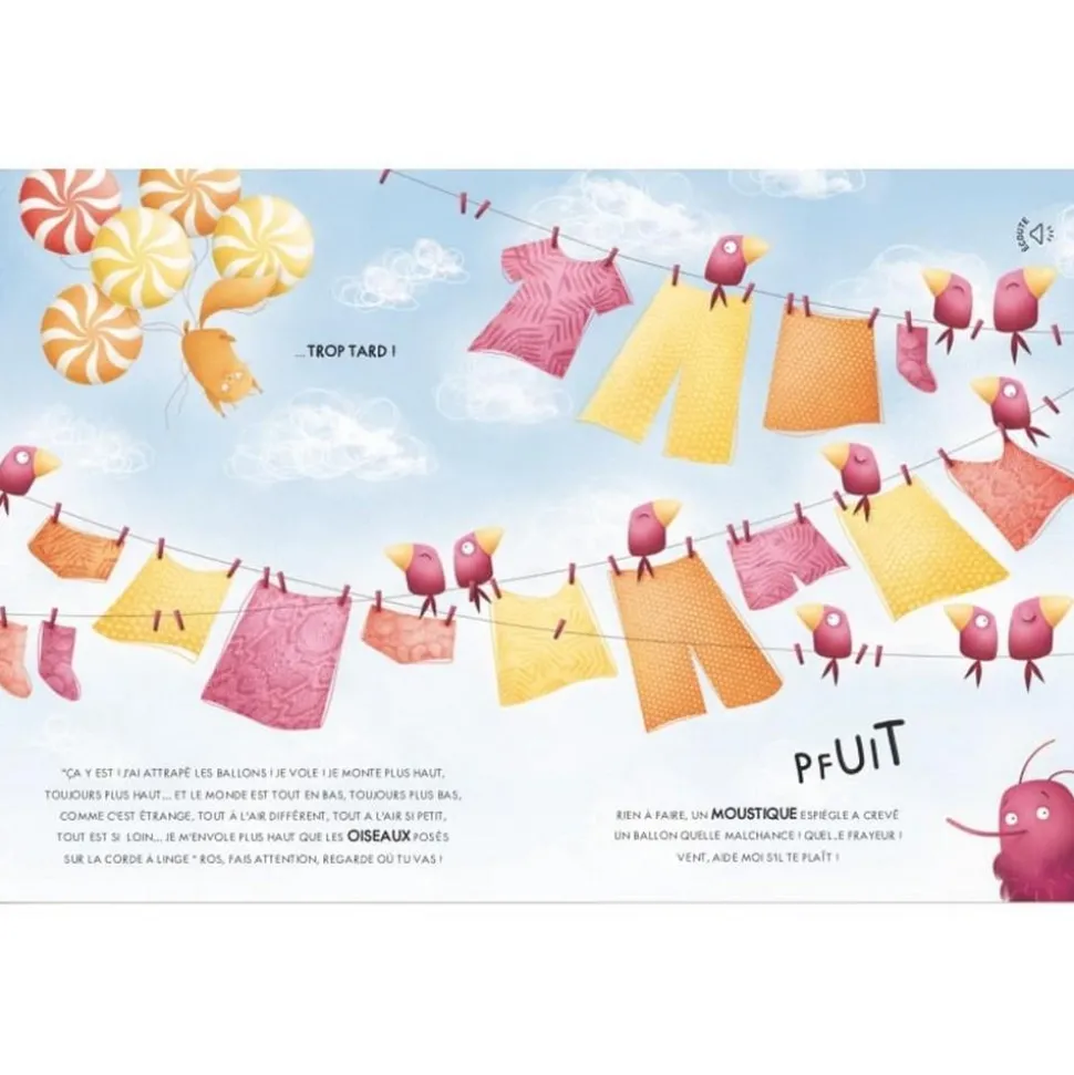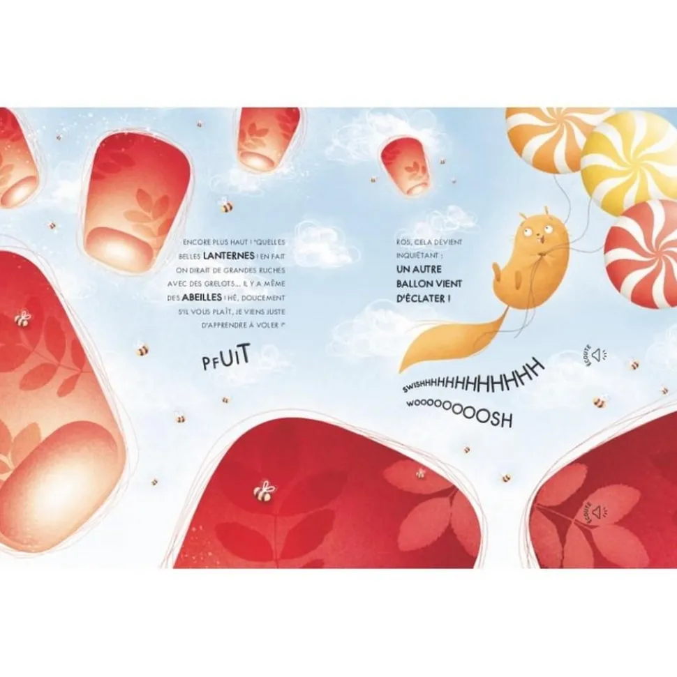 Un matin, un petit écureuil aperçoit des fils pendre de son arbre… ce sont des ballons ! Intrigué, il les attrape et se retrouve emporté dans les airs ! Mais un moustique taquin fait éclater les ballons un par un. Qui sait où le petit écureuil se retrouvera-t-il ! Lis les jolies histoires et écoute dix merveilleux sons de la nature. Ils t’accompagneront tout au long d’un récit plein de magie. Ce livre sonore au format cartonné et aux pages épaisses est parfaitement adapté aux petites mains curieuses. En appuyant sur les puces sonores disséminées dans le récit, l’enfant découvre des sons doux et enchanteurs qui donnent vie à l’histoire. Le texte tendre et poétique stimule l’imagination et invite à la rêverie, tandis que les illustrations colorées offrent un merveilleux support visuel. Un moment de lecture sensorielle et immersive à partager dès le plus jeune âge.