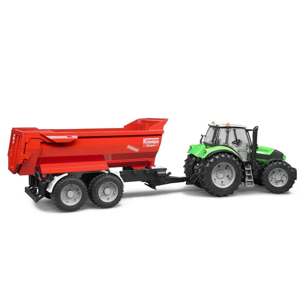 Ainsi, le centre de gravité est au milieu et une meilleure stabilité de conduite est atteinte qu’avec des structures en forme de bloc. Le vérin basculant est positionné au centre, devant la benne, ce qui permet sur le modèle original une transmission de force exceptionnelle dans la benne lors du basculement.. Le modèle réduit en profite également, grâce à un enclenchement échelonné qui enrichit l’expérience ludique et confère au jouet un aspect inégalé. La benne basculante semi-ronde à essieu tandem Krampe est un autre produit vedette de notr eprogramme de remorques agricoles