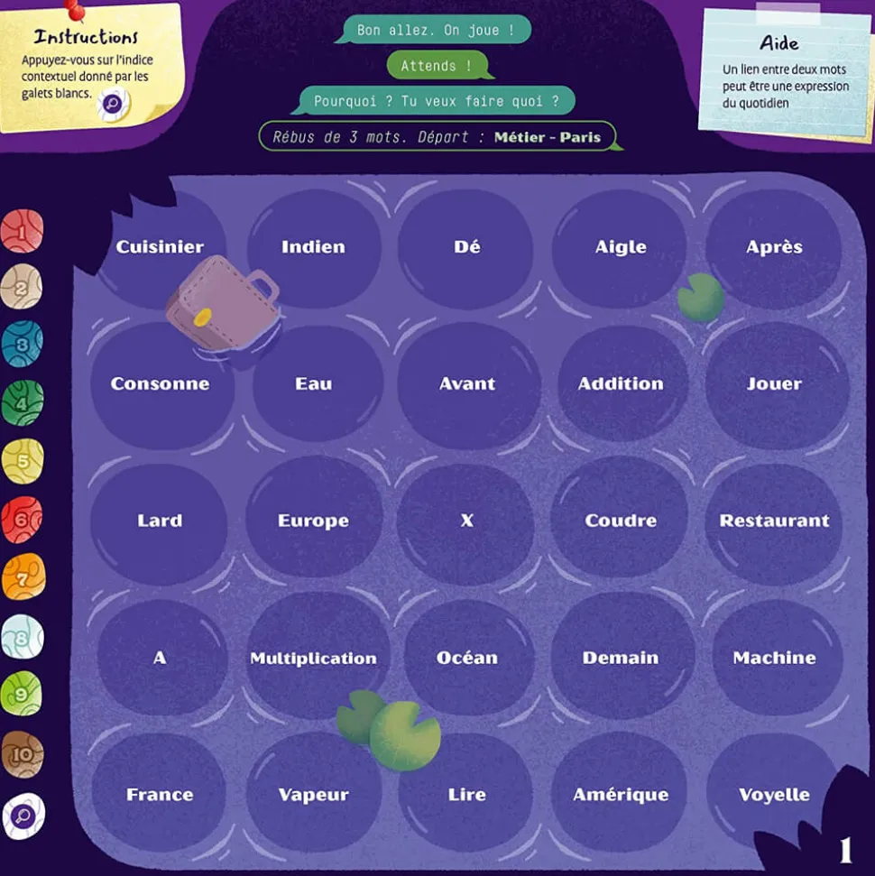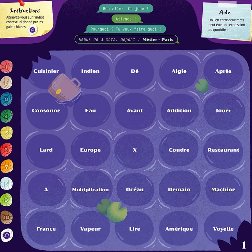 Suivez les aventures d’agents secrets loufoques dans une succession d’énigmes originales à résoudre seul ou à plusieurs. En utilisant les associations d’idées, faites des ricochets de mot en mot pour trouver le bon chemin et résoudre le rébus final ! 30 énigmes successives vous présentent l’aventure loufoque d’une équipe d’agents secrets. Chaque énigme est constituée d’un dialogue dont il faut découvrir la dernière phrase pour comprendre l’histoire, Pour la trouver, le ou les joueurs (en collaborant) doivent résoudre une grille de 25 mots dont la plupart doivent être cachés par des « galets ». Pour les placer, les joueurs doivent trouver des couples de mots obligatoirement alignés. Chaque couple de mots amène par ricochet (association d’idées) au couple de mots suivant, jusqu’à ce que tous les galets soient posés. A la fin, les mots encore visibles (de 3 à 5) présentent un rébus drôle qui, une fois lu à haute voix dans le bon ordre, permet aux joueurs de découvrir une phrase ! La dernière du dialogue… Le contexte et des indices permettent aux joueurs de trouver le bon ordre. En cas d’erreur de parcours, ils doivent retourner en arrière ou recommencer, en regardant si besoin les réponses fournies.