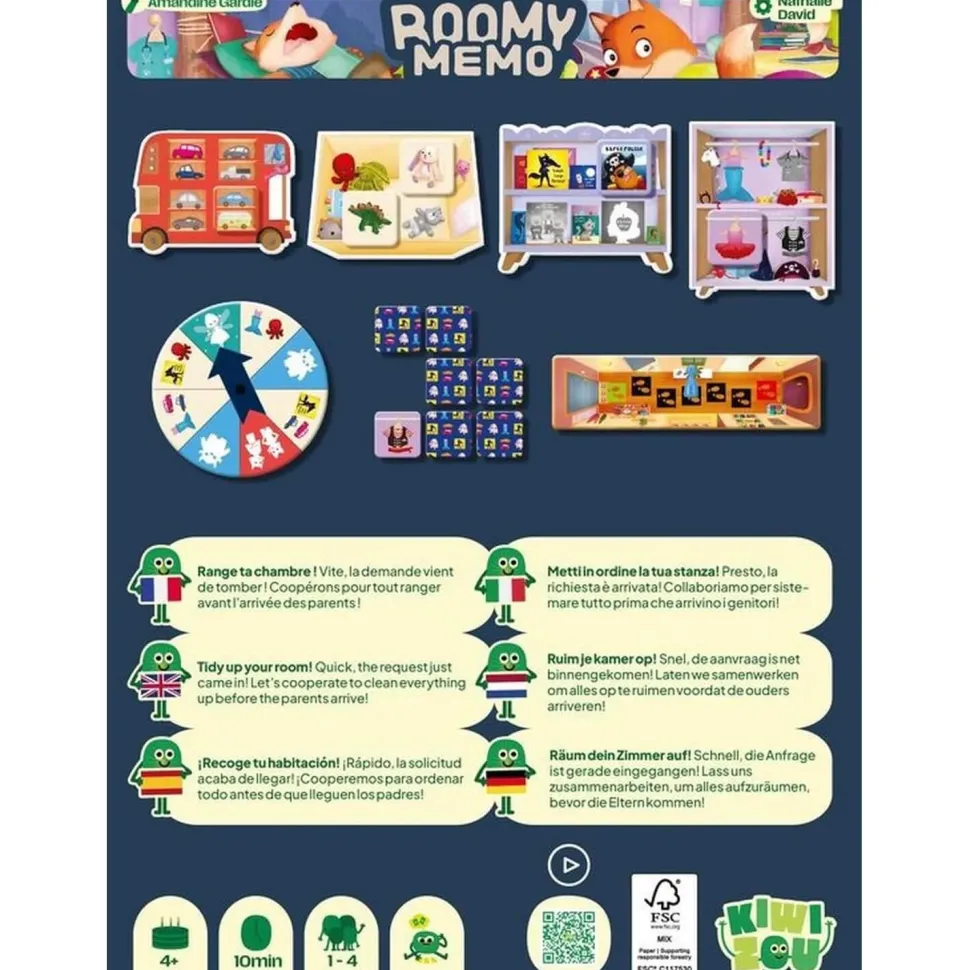 Des jouets traînent partout ? Il faut les remettre à leur place sans se tromper ! Chaque joueur doit mémoriser les emplacements, agir vite et bien pour éviter la catastrophe. Ce jeu malin développe la concentration, la coopération et le sens de l’observation tout en s’amusant. Roomy Memo est un jeu idéal pour initier les enfants à la collaboration tout en stimulant leur mémoire de façon ludique et joyeuse !