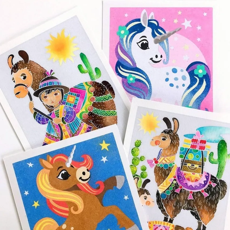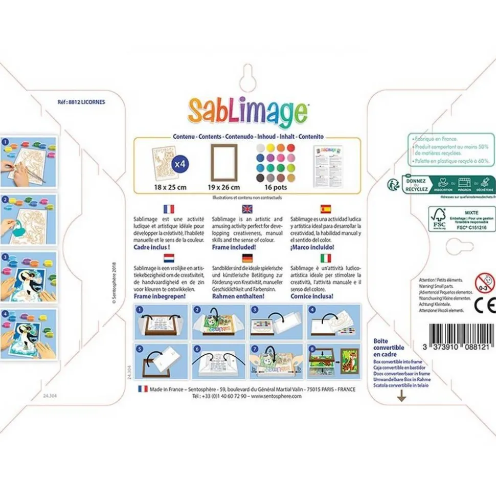 Découvrez de coffret de sablimage licornes adapté à partir de 4 ans. Si vous êtes fan de licornes ou que vous aimez tout simplement l’univers féérique qu’elles représentent et qu’en plus de ça vous appréciez les loisirs créatifs, ce coffret est fait pour vous !Retrouvez 4 tableaux représentant des licornes qu’il vous reste à personnaliser, libre à vous de suivre les modèles ou non. Cette gamme d’activité artistique a été conçue pour que de très jeunes enfants puissent réaliser de jolis tableaux sans se salir mais surtout, en toute simplicité. Pour cela, il suffit de décoller les surfaces préencollées et de les saupoudrer avec les différents sables proposés dans la boîte. Vous l’aurez compris, c’est un jeu d’enfant !Inclus dans le coffret : – 16 à 18 petits pots de sable- 4 tableaux- 1 petit couteau- Notice.Durée de l’activité : 2 à 3 heures.