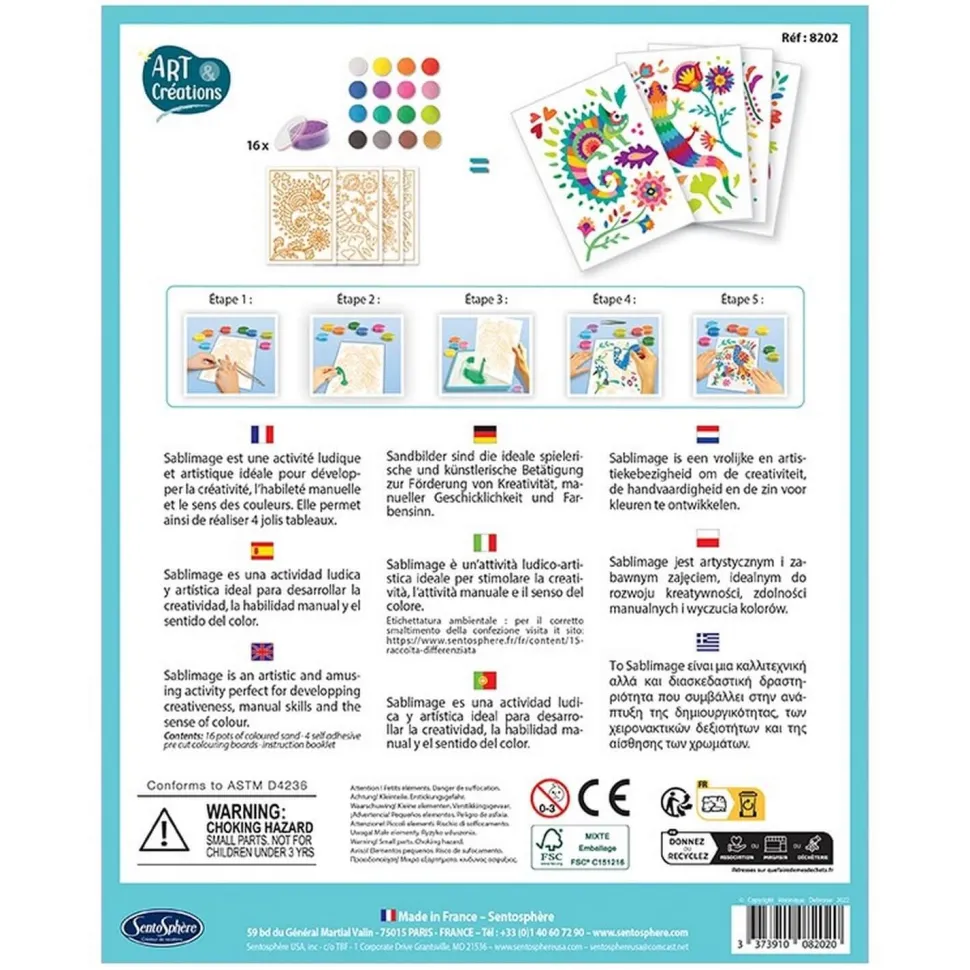 Sablimage est une gamme d’activité ludique et manuelle qui a été conçue pour que des très jeunes enfants puissent facilement, et en toute liberté, réaliser de jolis tableaux naïfs sans se salir. Il suffit de décoller les surfaces préencollées et de les saupoudrer avec les différents sables proposés. Couleur après couleur, chaque illustration prendra vie pour devenir un réel chef-d’œuvre.