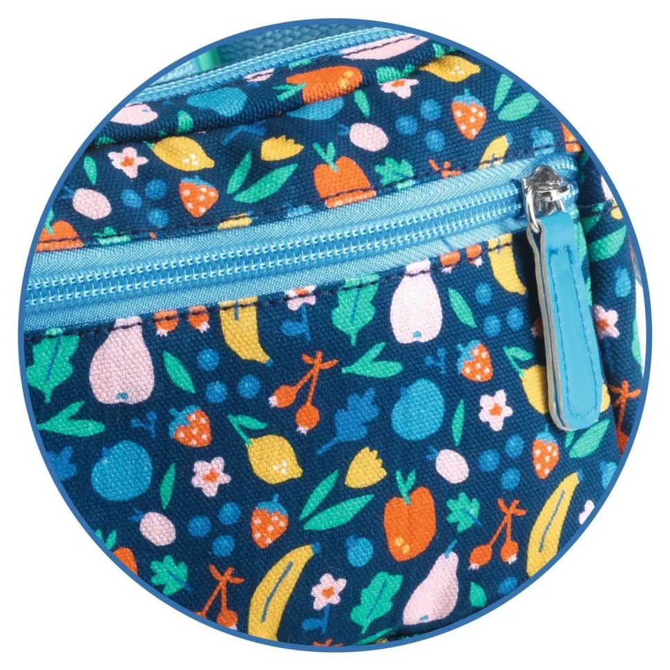 Un sac banane illustré sur le thème des fruits avec une grande poche centrale et une petite poche sur le devant. L’enfant peut le porter en bandoulière ou à la taille en fonction de son style.