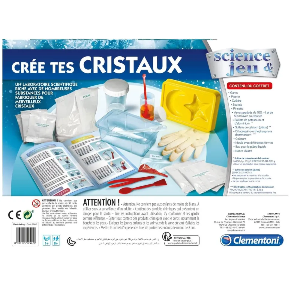 Ce kit de laboratoire fascinant contient tout ce dont tu as besoin pour créer d’incroyable cristaux translucides et colorés. Un coffret unique pour découvrir les réactions chimiques des sels et créer des formes étincelantes. Le manuel inclus te guideras à travers les différentes phases d’expériences afin que tu puisse t’amuser en toute sécurité !