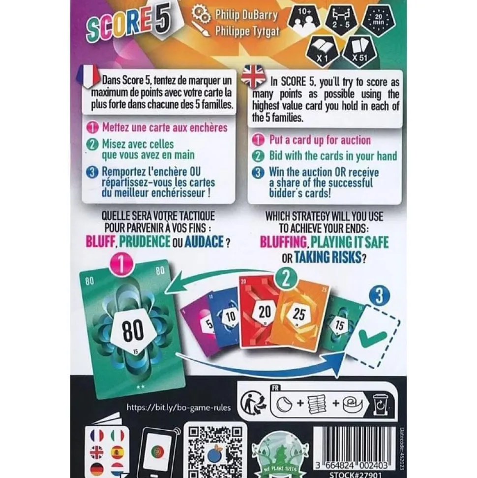 Découvrez Score 5 de la marque Tribuo. Tenez-vous prêts, 12 enchères vont démarrer. Le principe est simple : visez haut pour remporter la carte mise en jeu. Ne soyez pas inquiets, vous ne repartirez pas forcément les mains vides, car le gagnant de l’enchère vous laisse toujours vous partager les cartes de son enchère. Alors, quelle sera votre tactique pour parvenir à vos fins : bluff, prudence ou audace ? Ce jeu met à l’épreuve votre sens de la stratégie, de la négociation et votre capacité à anticiper les actions des autres joueurs. Il est idéal pour les amateurs de jeux rapides et tactiques.