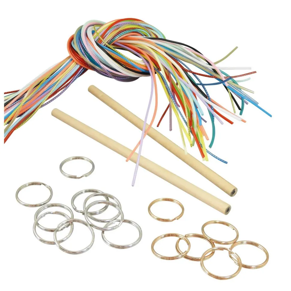 Contient: un assortiment de 55 fils scoubidous, 15 anneaux de porte-clés et 2 crayons de papier.