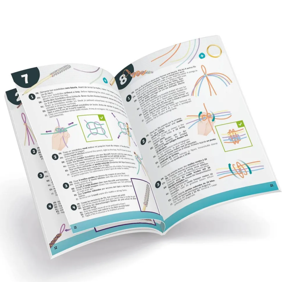 12 modèles de scoubidous à tisser ainsi que des fils supplémentaires pour faire ses propres créations!