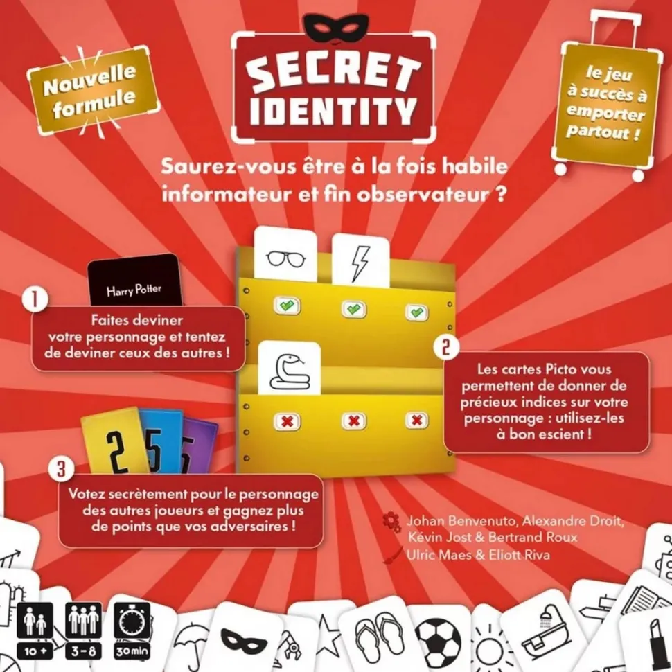 Secret Identity vous plonge dans un jeu de déduction unique où l’interprétation des pictos de vos amis est la clé pour percer les mystères des identités secrètes. Chaque joueur reçoit un personnage secret et doit, à l’aide de cartes Picto, donner des indices subtils/ Les pictogrammes, à la fois simples et évocateurs, offrent des interprétations infinies, laissant place à l’imagination.