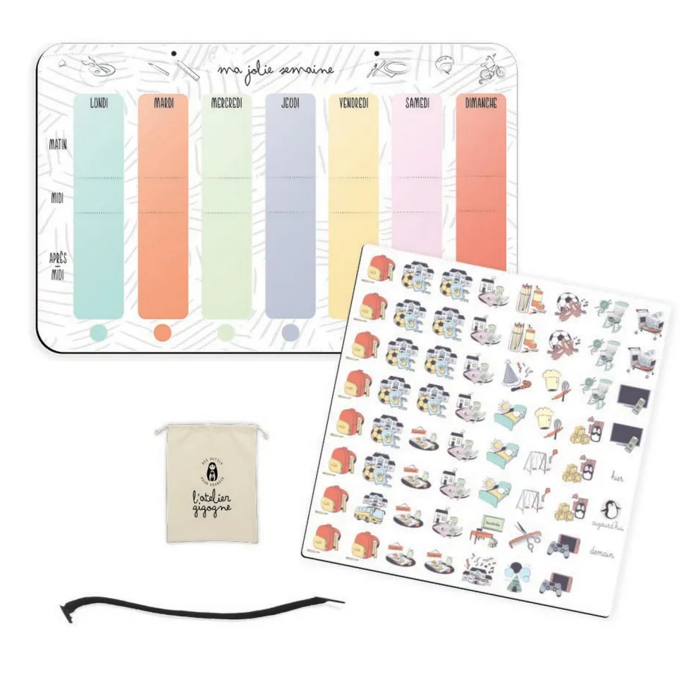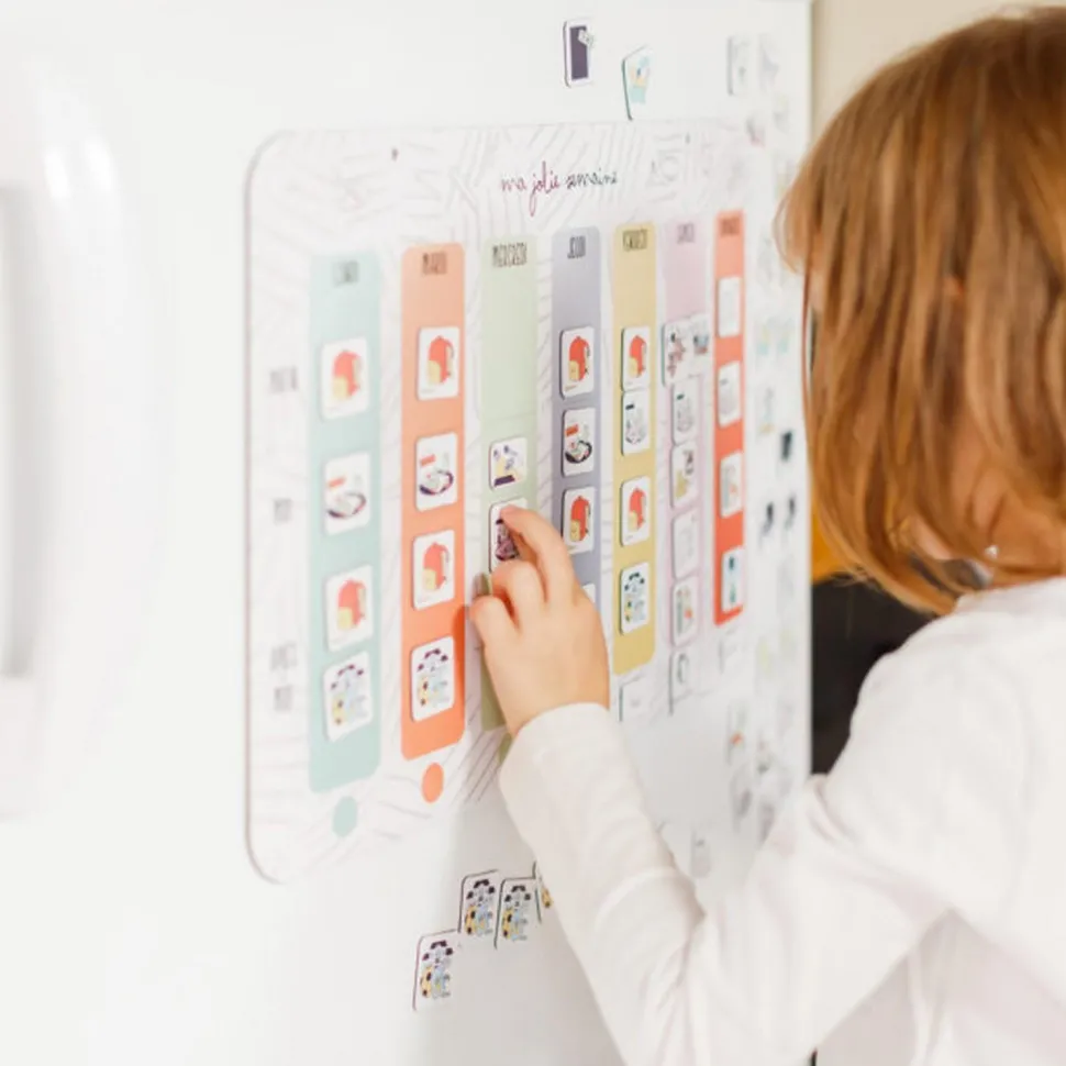 Les codes couleurs des jours et les magnets l’aident à visualiser ses activités quotidiennes, diminuant ainsi le stress lié aux séparations et/ou changement d’emploi du temps. Ce tableau magnétique est un excellent support pour l’aider à se repérer dans sa semaine : “est-ce qu’il y a école demain”, “où vais-je manger ce midi ?”. Votre enfant apprend aussi à distinguer : le matin, le midi, l’après-midi ainsi qu’hier, aujourd’hui et demain.