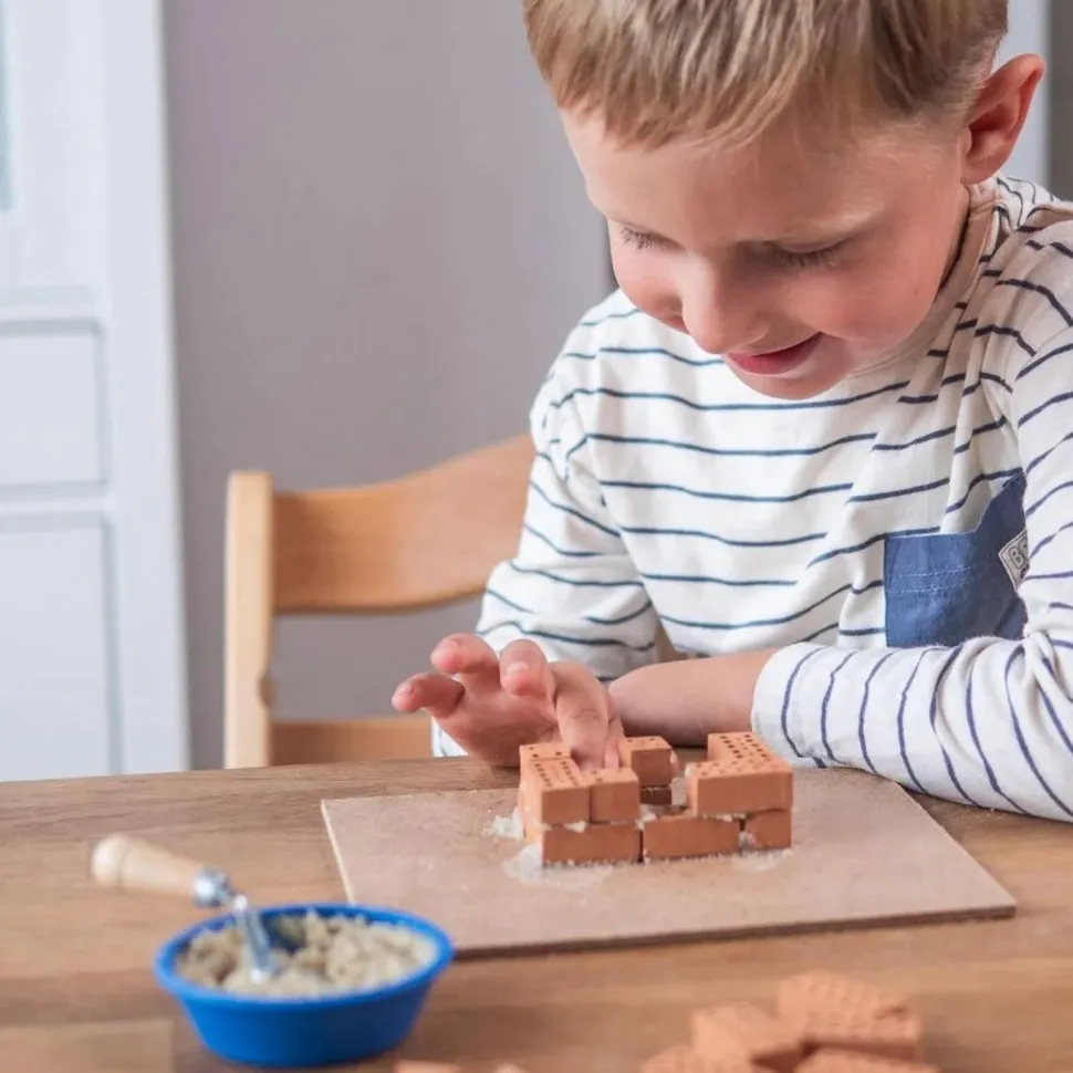 Contenu : 49x briques rouges, 20 demi-briques rouges, 17 triangles rouges, 8 panneaux de toit rouges, 4 panneaux rouges de demi-tôt rouge, 2 panneaux à ondes noires, 1x truelle, 1x bol de maçon, 1x bol de mortier.
