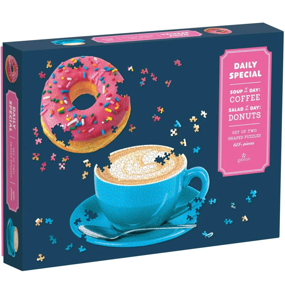 2 Puzzles forme de marque Galison.Dimensions du puzzle Donut : 29,2 x 27,9 cm environ.Dimensions du puzzle café : 42,5 x 27,9 cm environ.