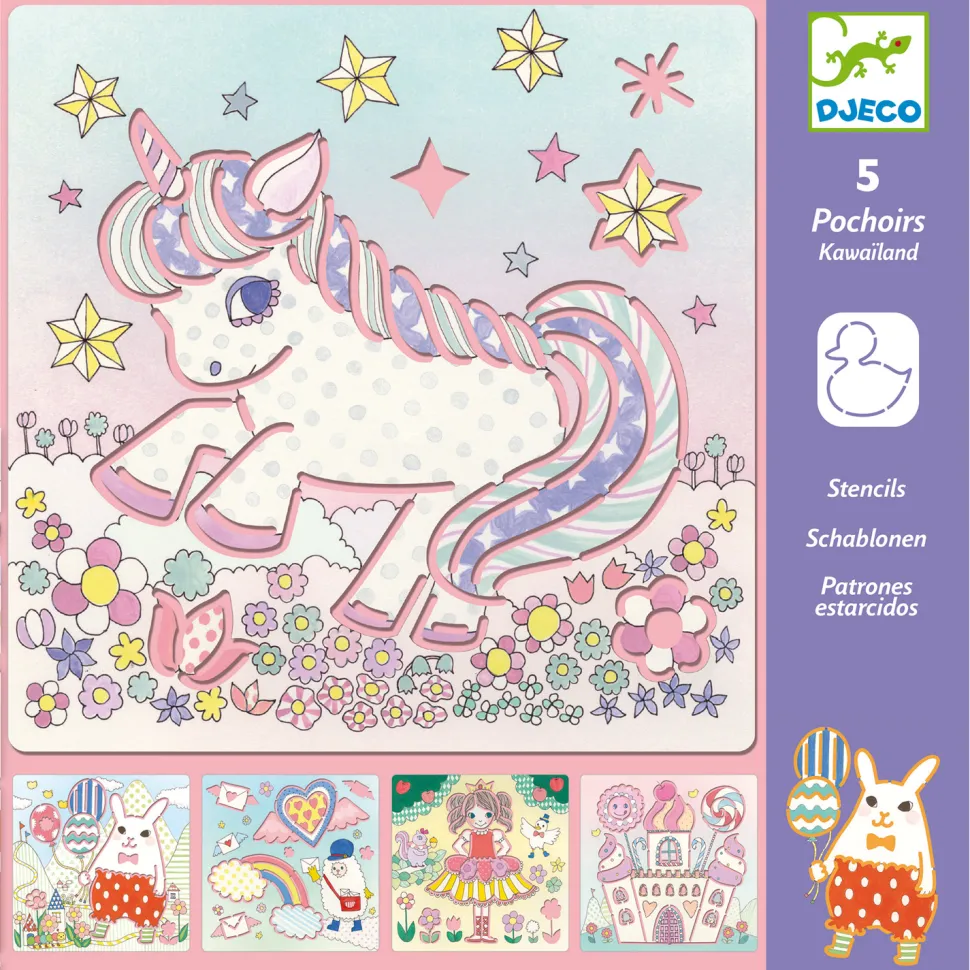 Retrouvez l’univers enchanté de Kawaïland, un monde de fantaisie entre licorne et lapin géants, avec ce set de pochoirs.Contenu :- 5 pochoirs format carréDjeco a imaginé une ligne de pochoirs adaptés aux enfants, à partir de 4 ans, pour leur permettre de réaliser de jolis dessins et d’exprimer leur créativité. Les plaques de pochoirs sont joliment imprimées, avec des fentes prévues pour bien guider le crayon. L’activité est donc facile et votre enfant peut la réaliser lui-même, sans l’aide d’un adulte.Une fois les contours terminés, il pourra alors colorier l’intérieur du dessin avec les couleurs qu’il désire, et en veillant à ne pas dépasser. Dimensions de la pochette : 22 x 23 cm.