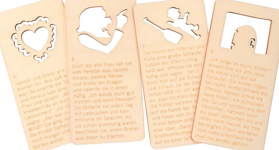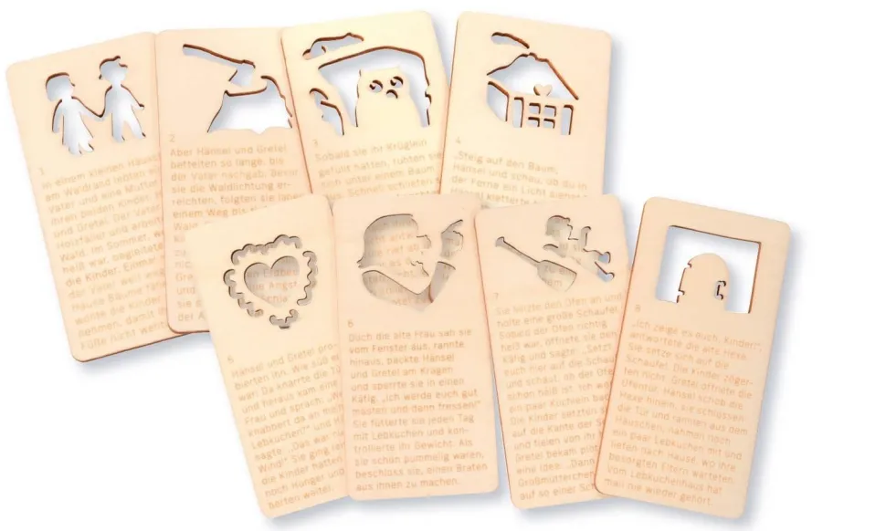 … Un extrait d’histoire est imprimé sur chacune des huit cartes en bois numérotées et le motif du spectacle est découpé pour être projeté sur une surface lumineuse. Lumière du soleil, lampe de poche, lampe de bureau, bougie, smartphone… Avec nos marionnettes à ombres de poche, les ombres peuvent être projetées n’importe où et les contes de fées peuvent être racontés comme des histoires. Conseil pour l’extérieur : observez les personnages en mouvement dans la nature.