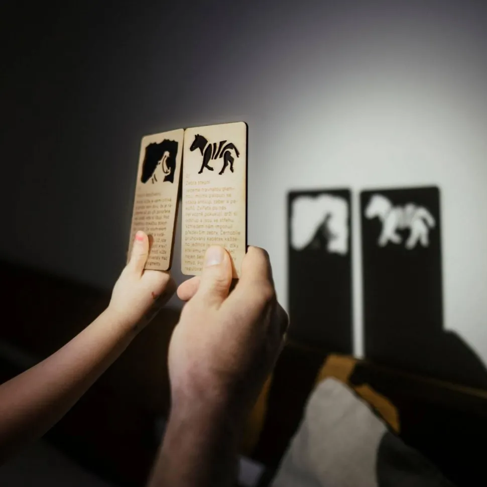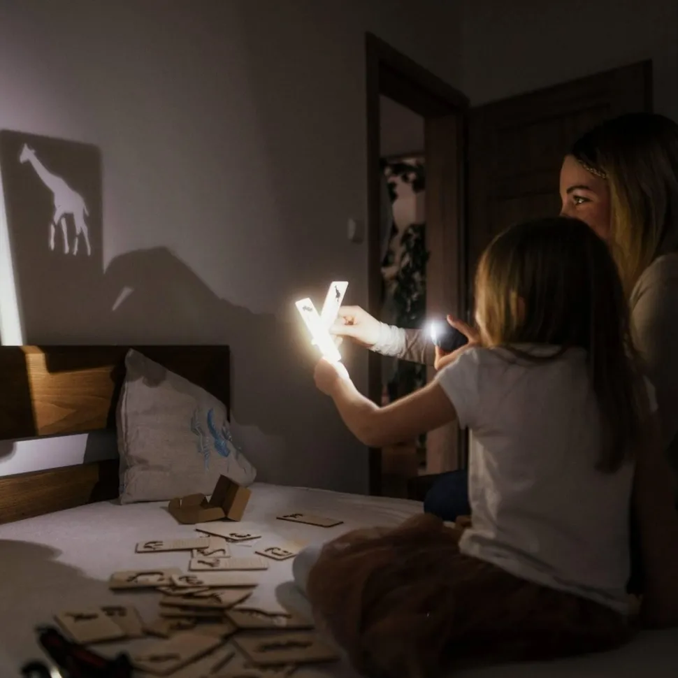 … Un extrait d’histoire est imprimé sur chacune des huit cartes en bois numérotées et le motif du spectacle est découpé pour être projeté sur une surface lumineuse. Lumière du soleil, lampe de poche, lampe de bureau, bougie, smartphone… Avec nos marionnettes à ombres de poche, les ombres peuvent être projetées n’importe où et les contes de fées peuvent être racontés comme des histoires. Conseil pour l’extérieur : observez les personnages en mouvement dans la nature.