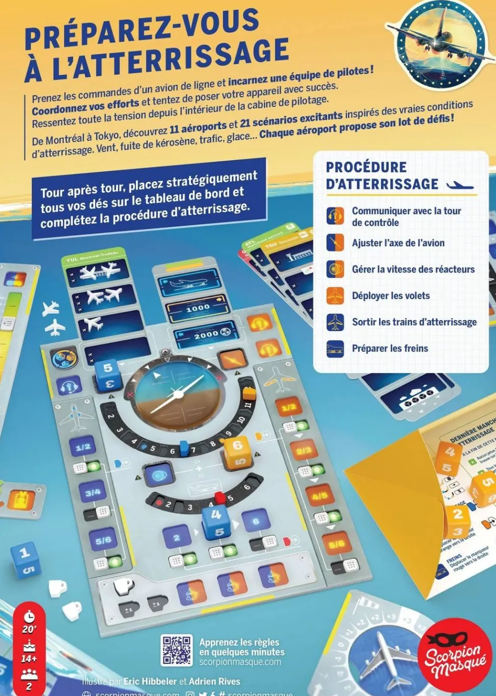 Pour rejoindre la terre ferme, les joueurs devront surveillez l’axe de l’avion, contrôler sa vitesse, déployer les volets, sortir le train d’atterrissage, contacter la tour de contrôle afin de réguler la circulation aérienne, et éventuellement, prendre un petit café pour améliorer leur concentration et modifier la valeur de leur dés.