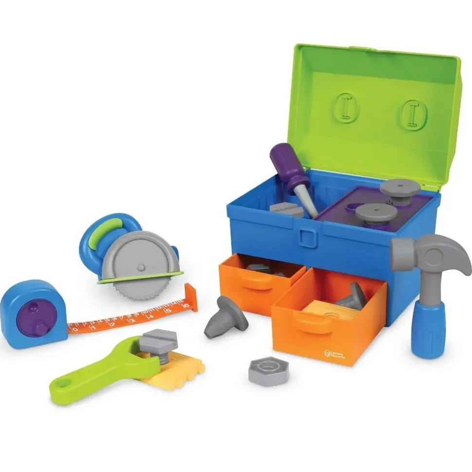 Contenu : une boîte à outils avec couvercle et 2 tiroirs, un marteau, 3 clous, une clé, 3 boulons, 3 écrous hexagonaux, 3 planches, une scie circulaire, un tournevis et un ruban à mesurer rétractable fonctionnel.