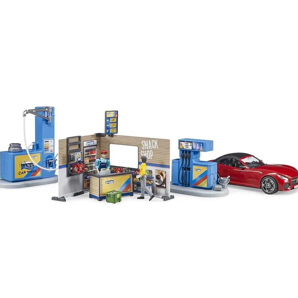Découvrez cet ensemble de jeu à l’échelle 1:16 de la marque Bruder comprenant une Station service bworld avec véhicule, figurines et une station de lavage, pour imaginer de nouvelles histoires avec vos véhicules.