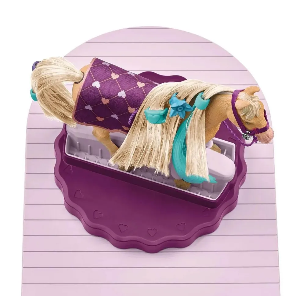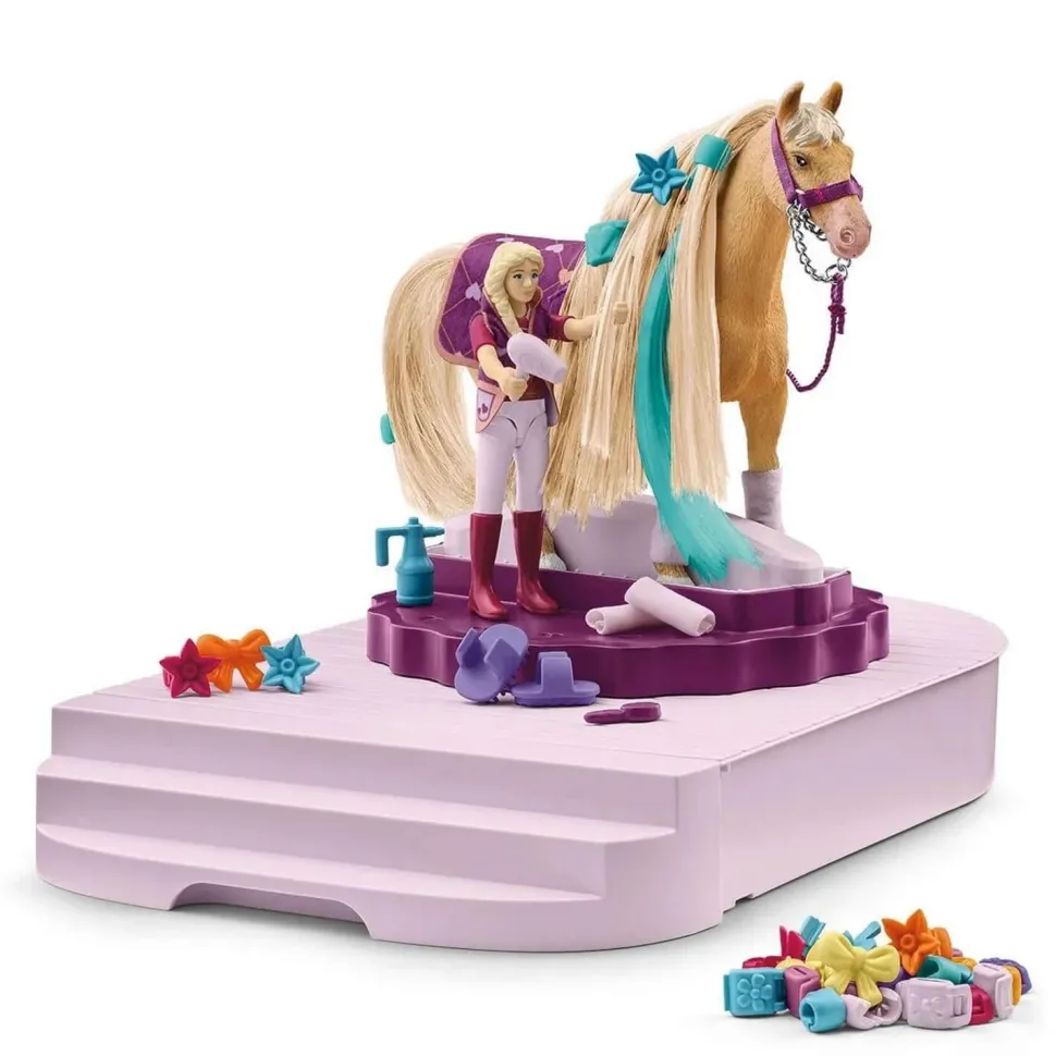 Dans la Station de soins pour chevaux Schleich, le cheval et la cavalière se coiffent ensemble ! Perles, nœuds, fleurs : tu peux t’en donner à cœur joie, et même ajouter une mèche supplémentaire. Pour montrer au monde entier qu’ils s’entendent à merveille !