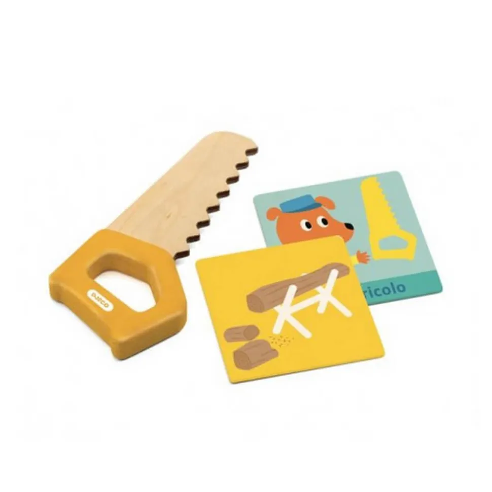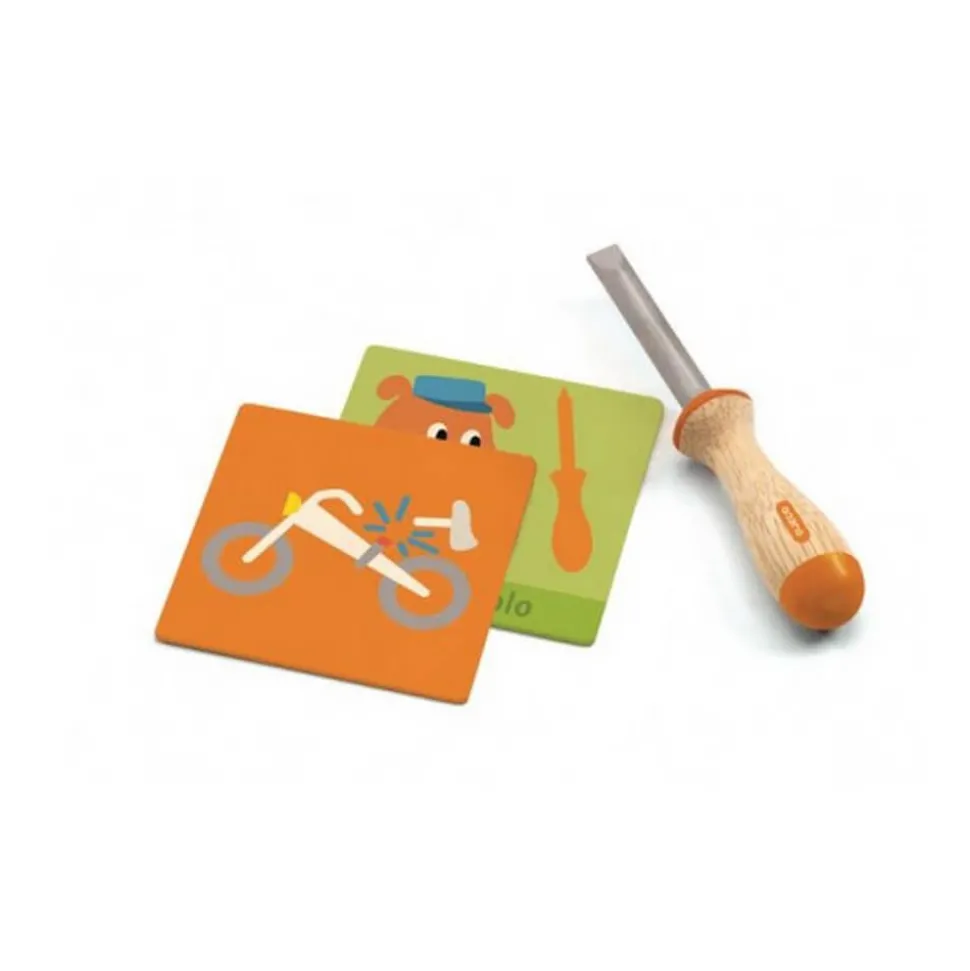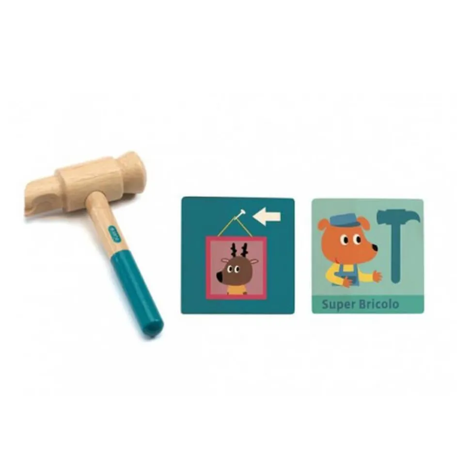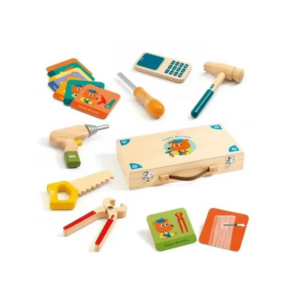 Cette boîte contient tous les outils en bois idéals pour dépanner comme les grands. Des outils de qualité accompagnés de cartes qui associent une situation et l bon outil que doit utiliser votre jeune bricoleur pour effectuer le réparation. Une activité manuelle, qui va développer l’imagination et la motricité de votre futur super bricolo !