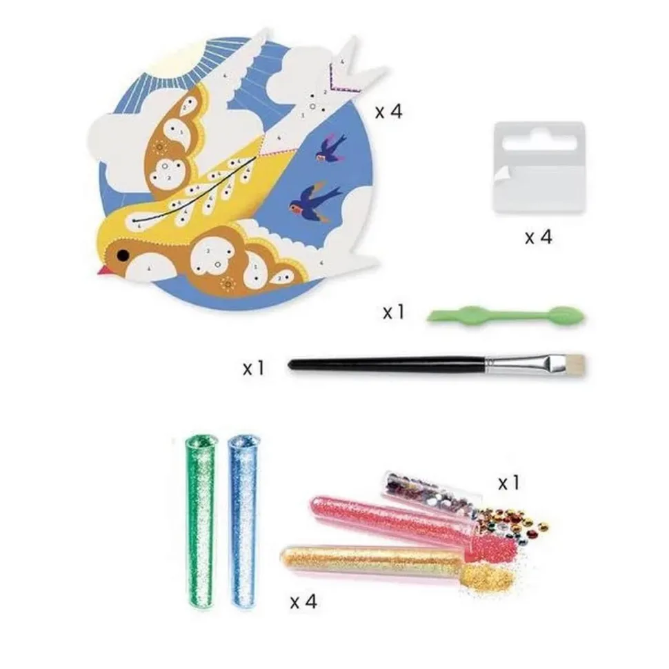 Découvrez les tableaux à pailleter avec strass de la marque Djeco dans une thème haut en couleurs avec ces oiseaux paradisiaques !