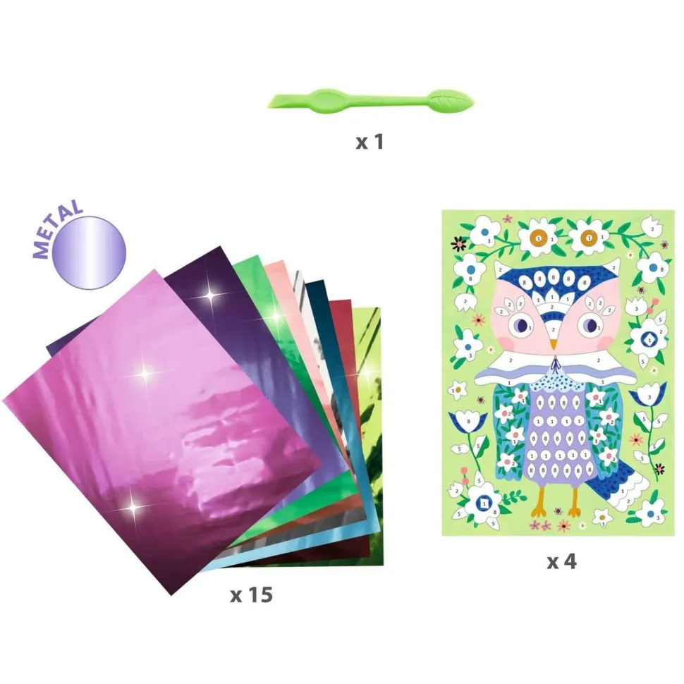 4 adorables animaux à décorer avec des feuilles métallisées. Grâce au code couleurs indiqué sur les planches, l’enfant repère les zones à métalliser. À l’aide de l’outil, il ôte la pellicule protégeant la surface encollée puis y dépose la feuille métallisée. La matière se dépose comme par magie et les tableaux s’illuminent. La boîte de rangement avec fermeture élastique permet de stocker son matériel une fois l’activité terminée.
