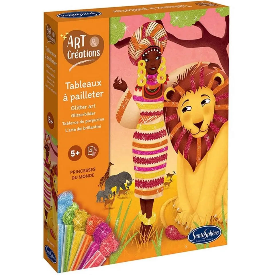 Faites le tour du monde et rencontrez les princesses du monde qui vous émerveilleront avec leur culture et magnifiques robes grâce à ces tableaux à pailleter de la gamme Art & Créations de Sentosphère !