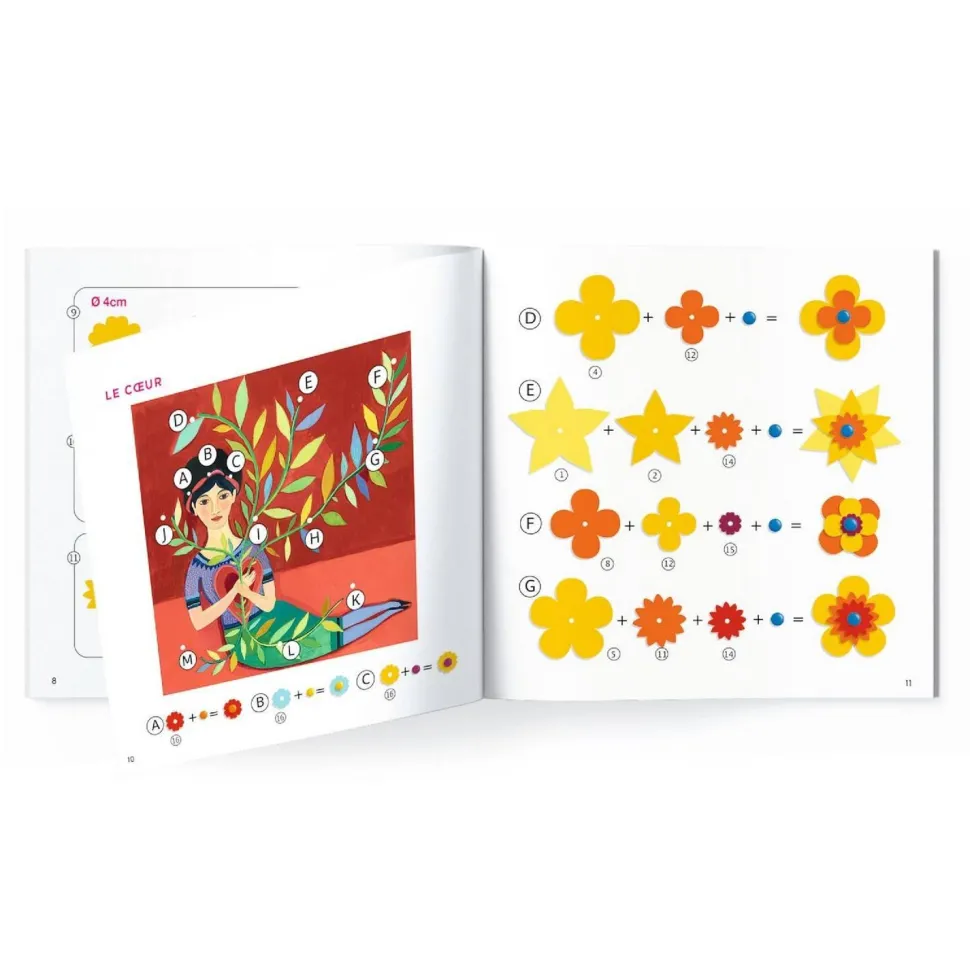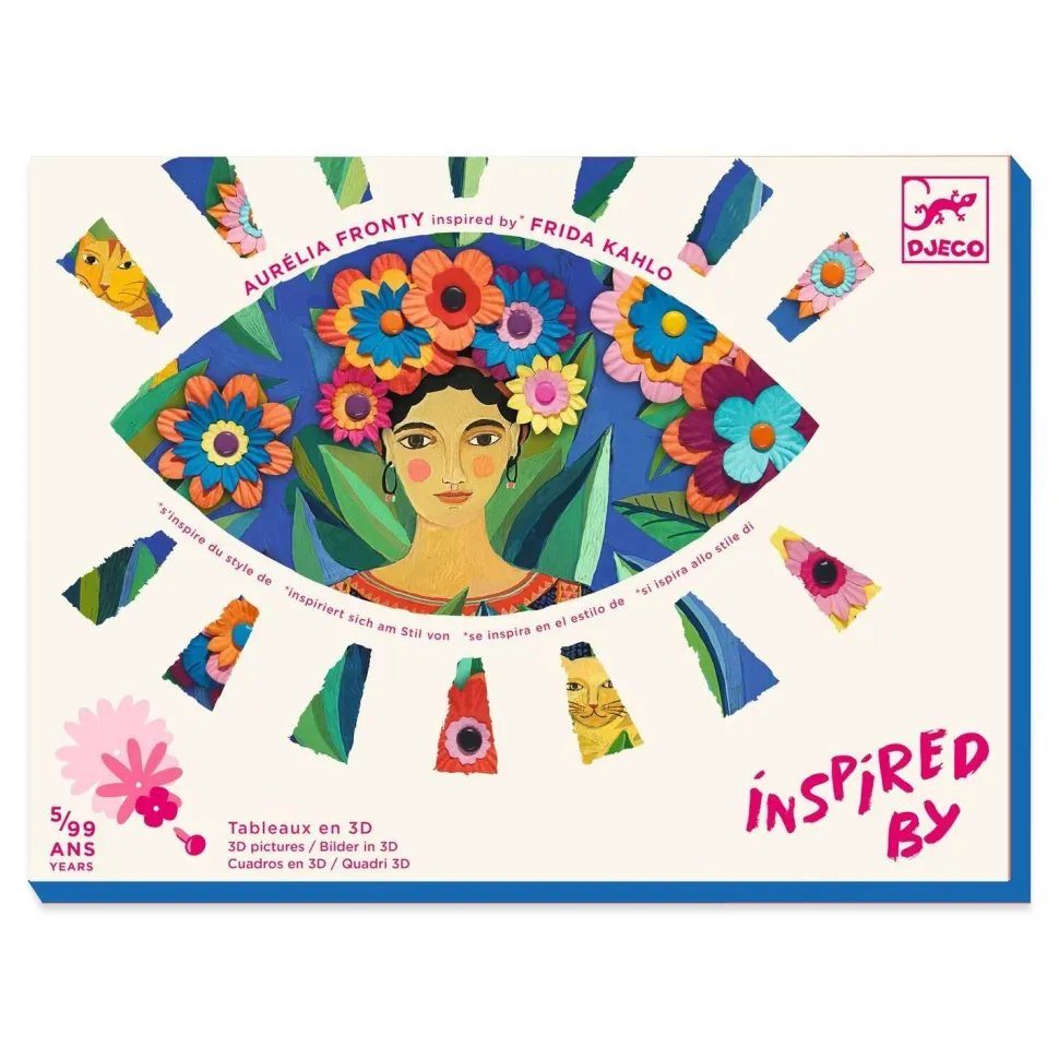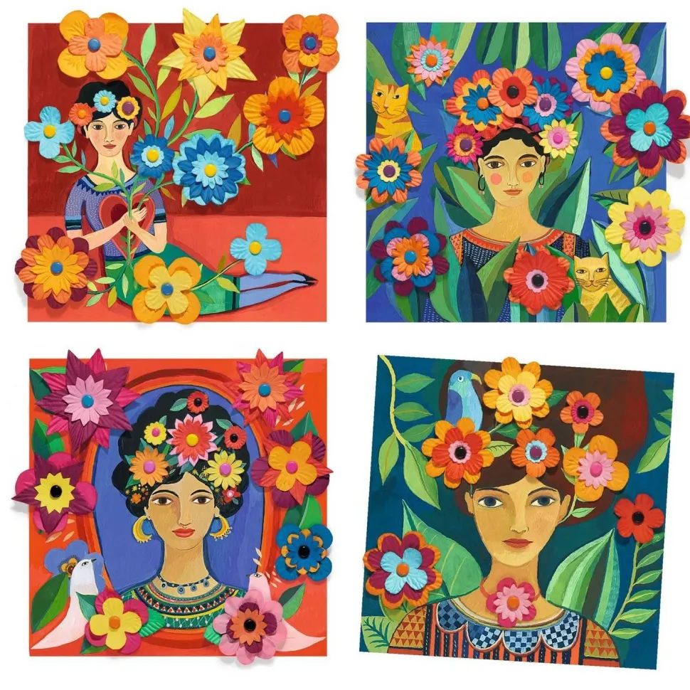 S’inspirant du travail de Frida Kahlo, où nature luxuriante et couleurs vives sont une ode à la vie, à l’amour et à la féminité, Aurélia Fronty propose d’enrichir 4 tableaux par l’assemblage et le collage de fleurs en papier gaufré de la marque Djeco.