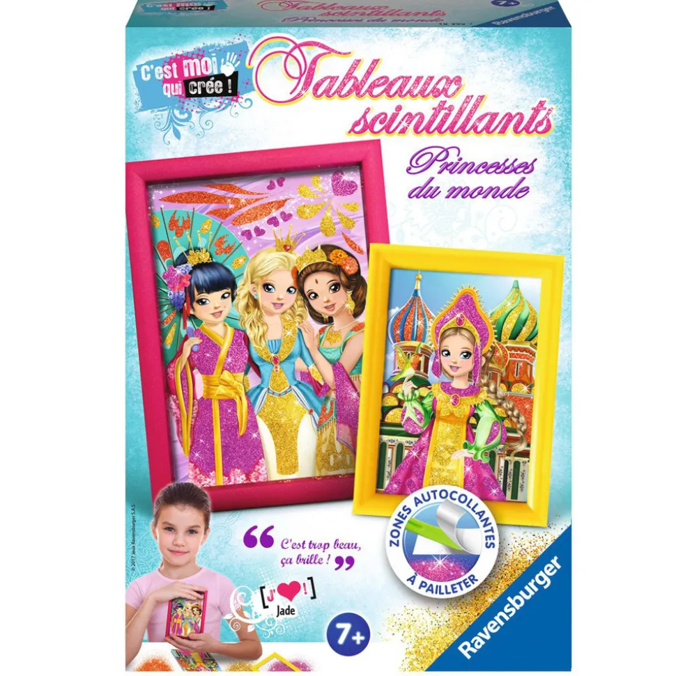 Plongez dans l’univers créatif des Princesses du Monde !Découvrez ce coffret comprenant deux tableaux avec plusieurs princesses aux différents coins du Monde joliment vêtues par de majestueuses robes pétillantes. Des princesses qui viennent de Chine, d’Inde ou d’Europe. A l’aide de la spatule verte, vous n’aurez plus qu’à dévoiler les zones autocollantes, appliquer sur les zones les paillettes rose, orange ou or avec le pinceau et finir par encadrer ces tableaux scintillants dans les cadres jaune et rose. Une création à exposer dans la chambre de votre enfant où il sera fier de la montrer à son entourage.De beaux tableaux scintillants à créer pour développer l’imagination de votre enfant dès l’âge de 7 ans.Contenu du coffret : – 2 tableaux autocollants imprimés à pailleter- 2 cadres et leur support- 3 sachets de paillettes- 1 outil pour dévoiler les zones encollées- 1 pinceau- 1 notice détaillée
