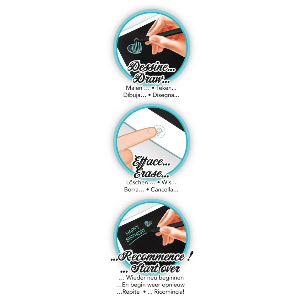 Ecris, dessine ou prends des notes sur la tablette à dessin avec écran LCD. Pour écrire, il suffit d’utiliser le stylet comme un stylo. Pour effacer, il suffit d’appuyer sur le bouton !