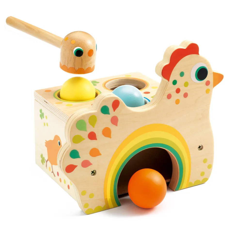 Aidez cette gentille petite poule à pondre ses oeufs ! Recommandé pour les enfants de 18 mois et plus, Tapatou est un jeu de tap-tap entièrement en bois qui comprend une boîte en forme de poule, un maillet et 3 boules colorées.Les enfants commencent par disposer les boules dans les trous situés au sommet de la boîte. En tapant vigoureusement dessus avec le maillet, ils vont les faire rentrer à l’intérieur de la poule. Grâce au plan incliné, les boules ressortent par la grande ouverture, donnant l’illusion que la poule est en train de pondre des oeufs ! Un passionnant jeu d’adresse, idéal pour développer sa motricité fine, sa coordination main-oeil et son intérêt pour le petit monde de la ferme. Diamètre des boules : 4.5 cm environ.Dimensions de la poule: L20 x l16 x H18 cm.