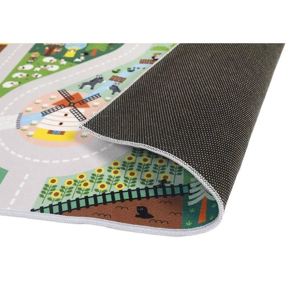 Dans ce décor bucolique et champêtre, on passe de la ferme à la forêt, et même par le centre équestre ! Sur leur tapis de jeu avec circuit, les petits s’amusent sur les routes sinueuses de campagne à la recherche d’éléments cachés. On repère où se trouve le loup dans la forêt, le fermier dans son tracteur, et on s’amuse des petits canards qui traversent la rivière … Il y a tant de bâtiments, d’animaux et de personnages représentés ! Avec leur tapis de jeu en tissu, les enfants développent leur imagination et leur vocabulaire, mais aussi leur sens de l’observation. Les plus petits découvrent même les couleurs et les chiffres de 1 à 10 ! Autre atout de ce tapis de jeu pour enfant : il est antidérapant ! Parfait pour y faire rouler des petites voitures, ou tout simplement pour les petits qui ont la bougeotte.