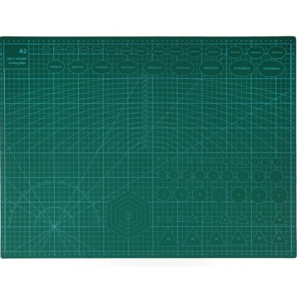 Multiples repères de coupes : quadrillages en ½ cm et cm, arc de cercles, triangles, disques, rayons, équerres.