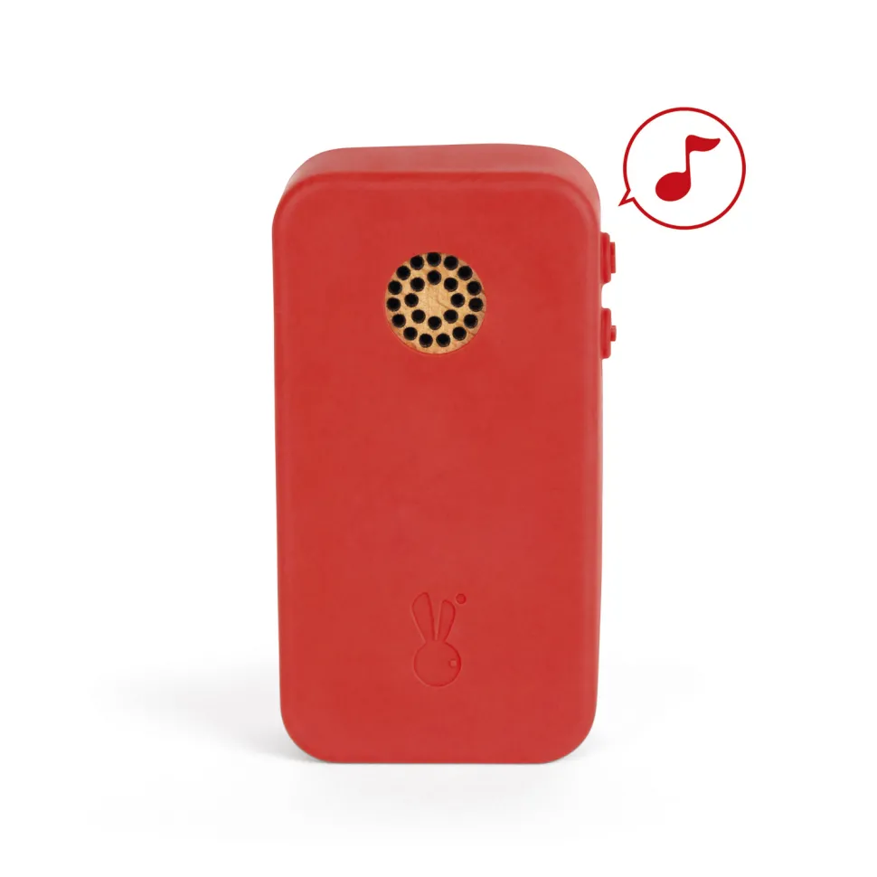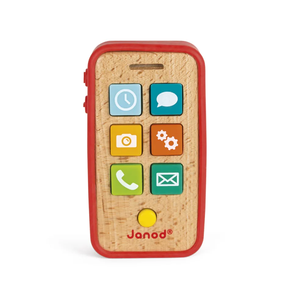Dring ! Dring ! … Allô !Avec ce téléphone sonore votre enfant pourra répondre comme les grands ! Ludique, ce téléphone réalisé en bois au look vintage permet aux tout-petits dès 18 mois d’imiter papa et maman au téléphone. Pour cela, le jouet comprend 7 touches sonores en plastique souple (message, téléphone, mail, photo, horloge et outils) sur lesquelles il pourra facilement appuyer. La coque en silicone qui entoure l’appareil est amovible pour pouvoir la retirer. Ce produit nécessite 3 piles LR44 incluses. Dimensions du téléphone : 6,5 x 2,5 x 12 cm.Découvrez aussi dans la même collection, l’appareil photo sonore en bois disponible sous la référence Janod-J05335.