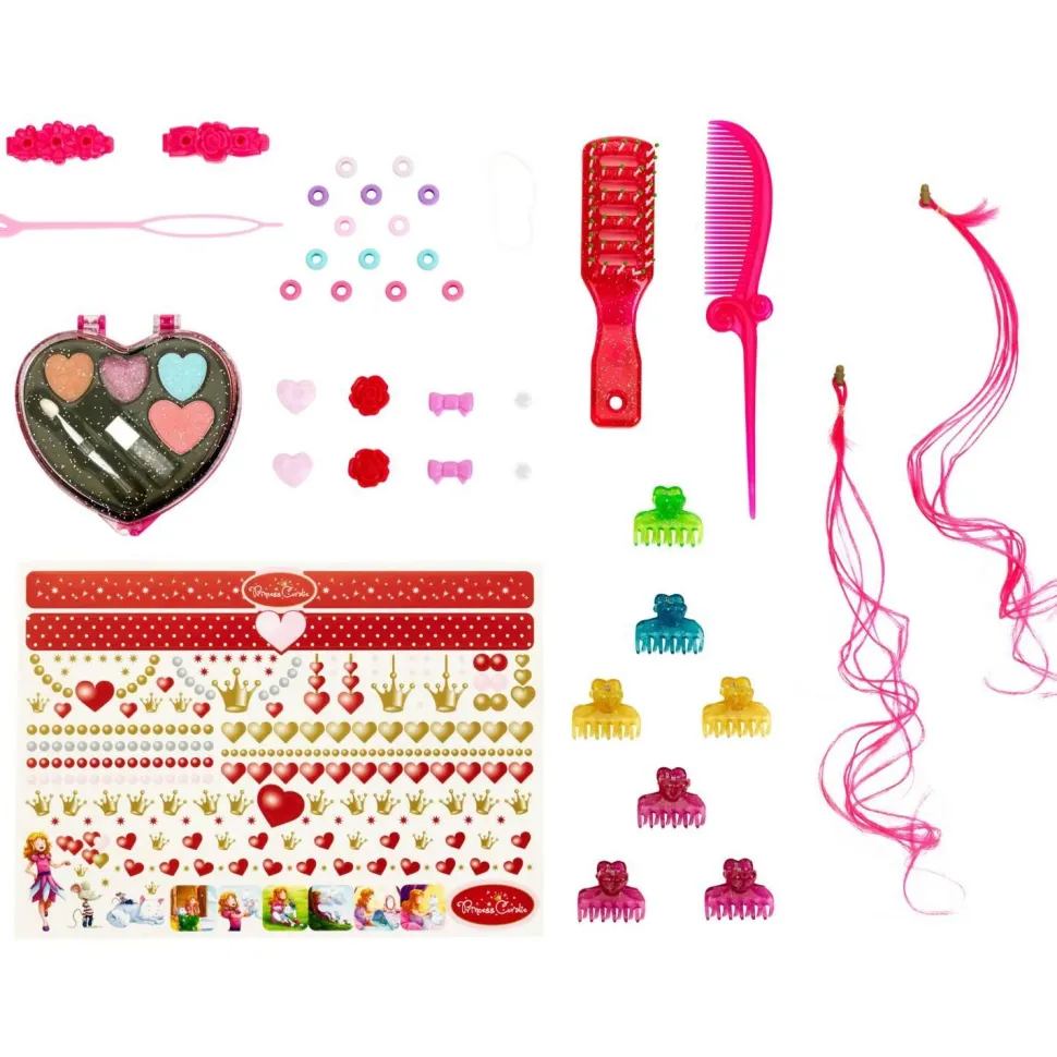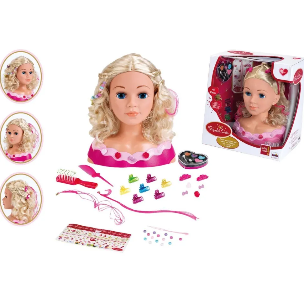 Tête à coiffer et maquiller « Emma » l’accessoire principal de cette ravissante tête à coiffer et à maquiller de 27 cm de haut est sans conteste la palette de produits cosmétiques en forme de coeur, gloss, fard à paupières et rouge à joues, tous testés dermatologiquement. Le matériel de coiffure est tout aussi impressionnant: brosse, peigne, deux mèches à clipper, un set de perles pour cheveux, sept clips à cheveux, deux barrettes ainsi que des pins pour orner le joli décolleté de la Princesse, une feuille de stickers et de bons conseils de styling pour des coiffures plus tendances les unes que les autres.