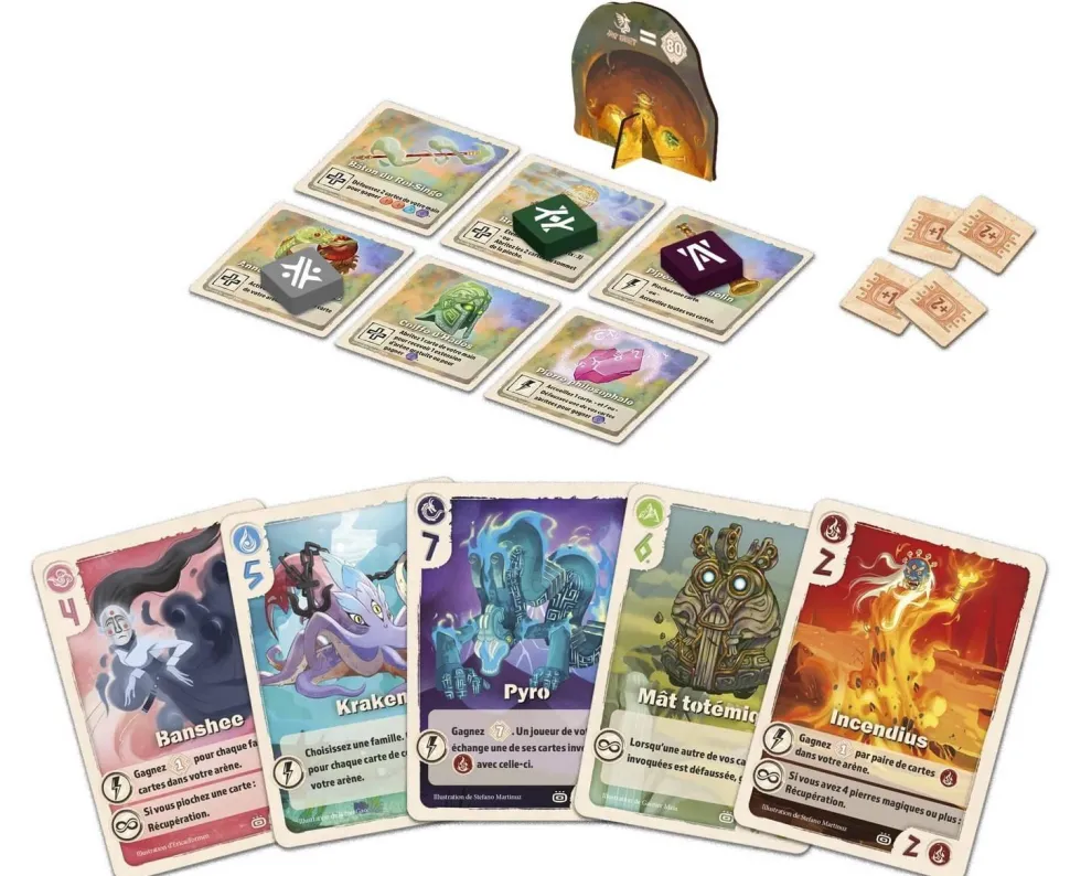 Chaque tour, les joueurs choisissent un artefact, introduisant de nouvelles règles de jeu telles que l’Accueil et l’Abris. La piste de score s’étend jusqu’à 80 points, et vous pouvez découvrir 24 nouvelles créatures légendaires.