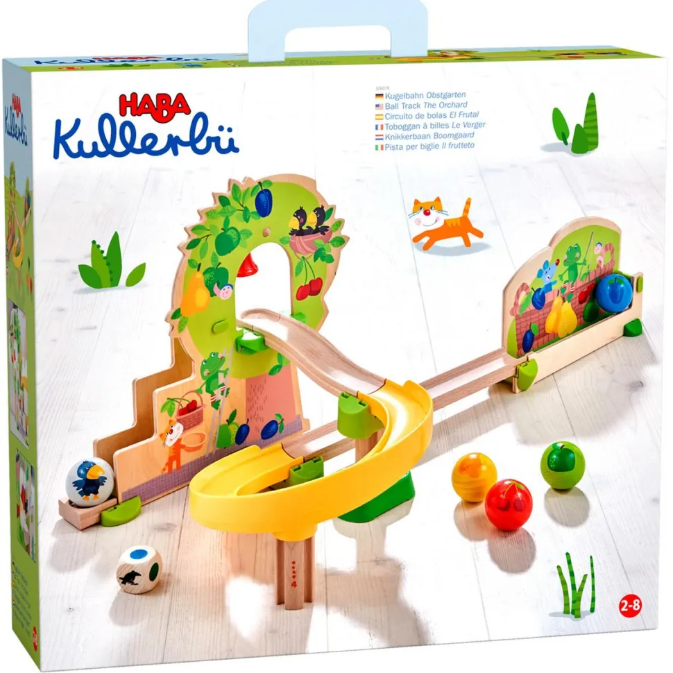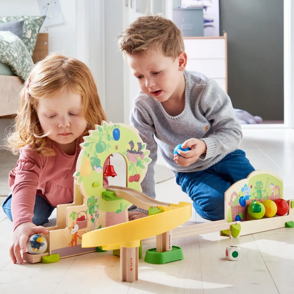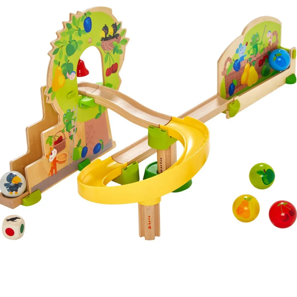 Là! Tout en haut de l’arbre, les plus beaux fruits en forme de billes sont prêts à être cueillis. Il suffit d’une petite impulsion et les voilà qui dévalent le virage en spirale. Il ne reste plus qu’à les ramasser ! Mais, que se passe-t-il encore? Un corbeau filou se lance dans une course-poursuite avec ces concentrés de vitamines ! Les enfants parviendront-ils à le devancer pour attraper les fruits ?