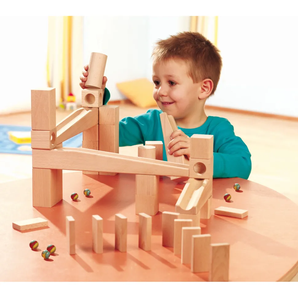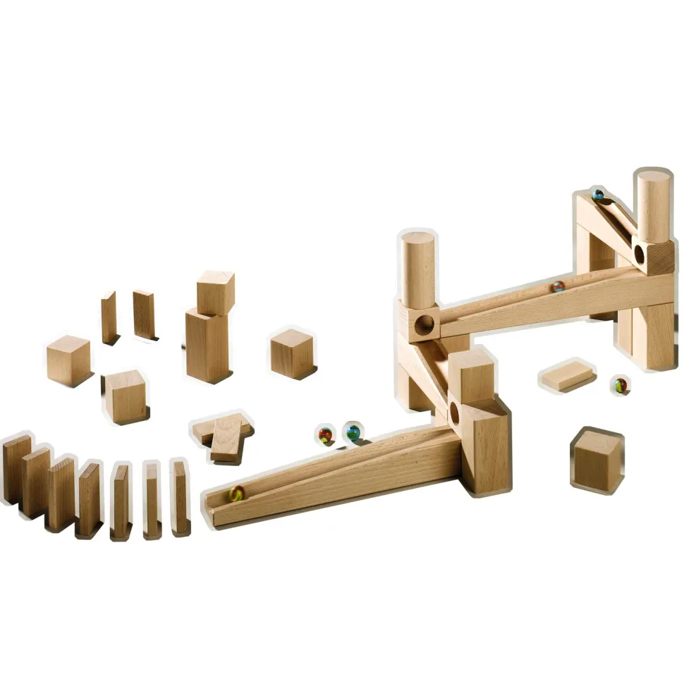 Toboggan à billes pour débutants de HabaLes toboggans à bille sont toujours fascinant.HABA démarre ici un système complet, qui peut facilement être compliqué ou agrémenté de surprises…Contenu de la boîte : – 2 rampes ( 32 cm ) – 2 rampes ( 16 cm ) – 12 cubes ( 8 x 4 x 4 cm ) – 5 cubes ( 4cm de côtés ) – 3 éléments de déviation ( 4 cm de côtés ) – 2 colonnes ( 8 cm ) – 12 dominos – 6 billes en verre – 1 livret de 24 pages de conseils et d’astuces.Les éléments sont en hêtre massif.