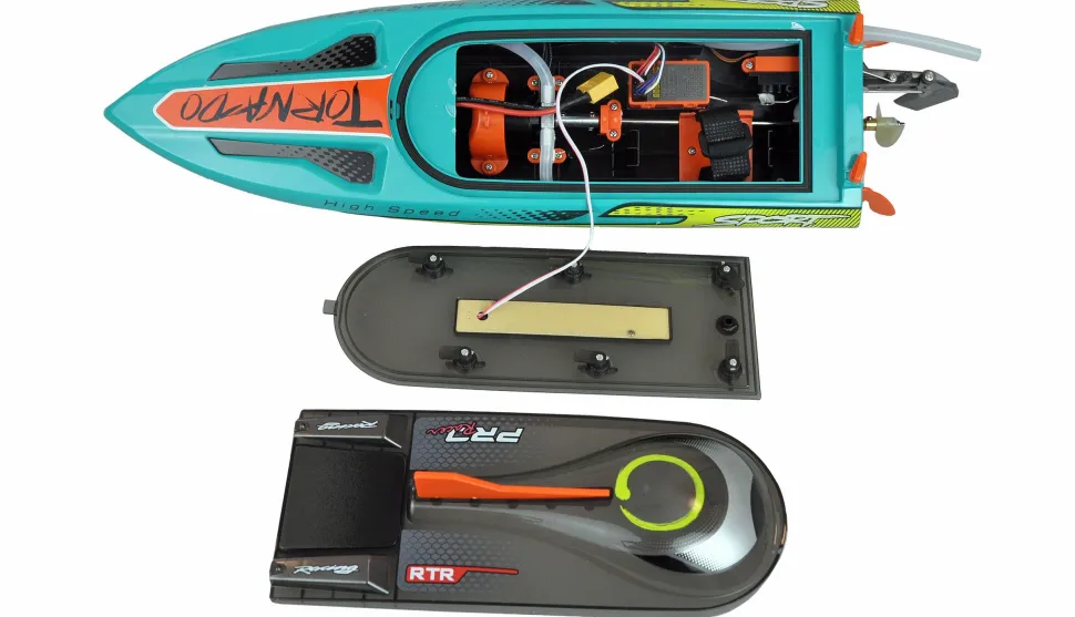Un accu puissant, une puissance brushless, une commande entièrement proportionnelle de 2,4GHz, un refroidissement par eau et une vitesse maximale d’environ 65km/h – ce sont les ingrédients de notre nouveau bateau de course « Tornado » en version RTR (Ready-to-Run). La livraison comprend déjà tout ce qui est nécessaire pour la mise en service du bateau d’une longueur de 470 mm, à l’exception des piles usuelles pour la télécommande : Il suffit de recharger le LiPo 3S 11,1V 1600mAh fourni avec le câble de charge USB correspondant et le Tornado est prêt à décoller. Deux hélices de rechange et des outils de montage sont également inclus dans le kit.